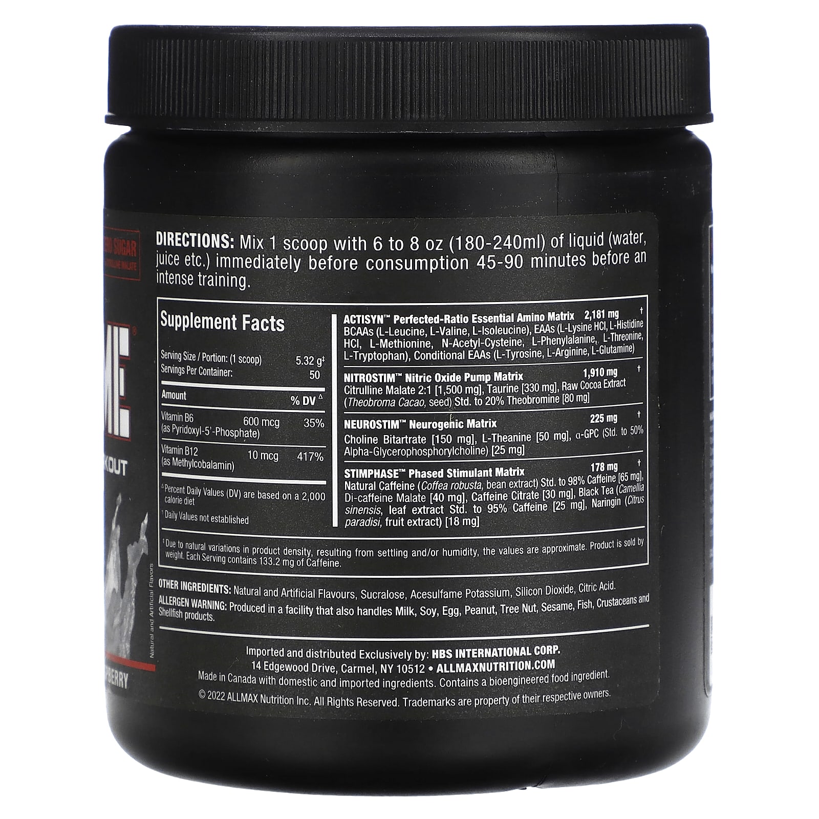 Zero Sugar1.5 g Citrulline Malate4 Stage Stimulant MatrixNeurogenic Mental FocusExplosive Pump ActivatorAll 9 Essential Amino AcidsLab Tested – Every LotGluten Free TestedNo Artificial Color or DyecGMP Registered FacilityHigh-Stim, Great Pump, Clean FormulaNow with 2x the Muscle Building Power as Protein and 4 Key Components for the Best Workout Ever!1) Energy – Stimphase™ 4 unique forms of caffeine for extreme, sustained energy that will last for your entire workout.* 2) Mental Focus – Neurostim™ Neuro-cognitive enhancing choline and Alpha GPC for laser focus. 3) Pump – Nitrostim™ A more potent form of Citrulline Malate (2 to 1) than other pre-workouts for increased blood volume and insane veins that turn heads in the gym.* 4) Muscle Power – Actisyn™ More effective than standard protein because all 9 essential (and 4 conditionally essential) amino acids are dosed in a specific ratio designed for your body to build muscle. These amino acids are essential because they cannot be made by your body like other amino acids. If your body is lacking in any one of these EAAs, muscle building will be limited.
