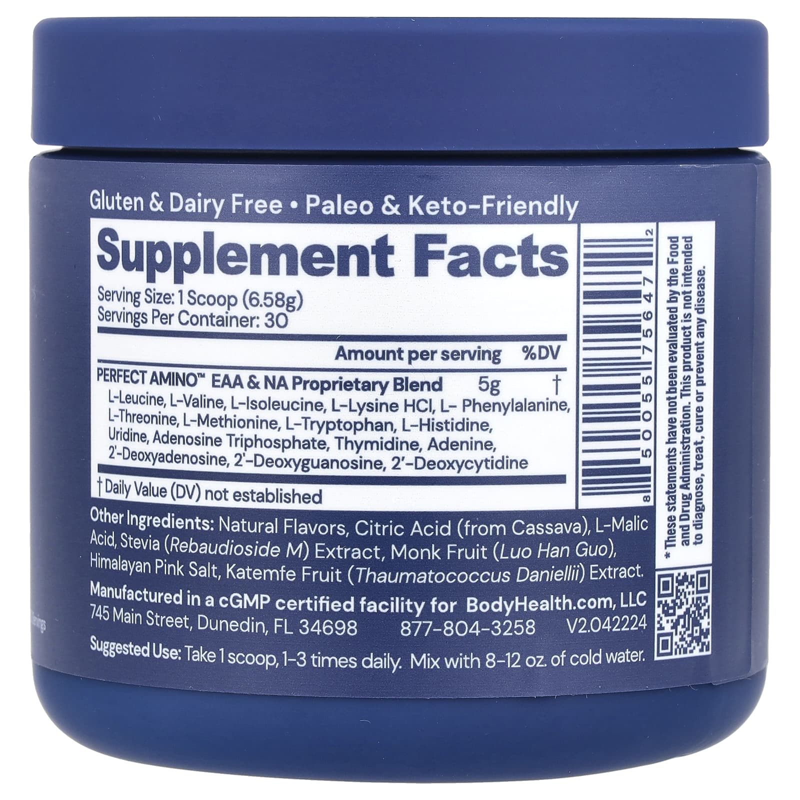 Essential Amino Acids Optimized For Maximum UtilizationContains Nucleic Acid Building Blocks The True Science of Protein Vegan Dietary Supplement Gluten & Dairy FreePaleo & Keto-FriendlyBuild Lean MuscleBoost PerformanceSpeed RecoveryPERFECT AMINO™ dietary supplement is utilized up to 99% to help build new protein, muscle & collagen without the caloric impact & without breaking a fast. It is supplemented with Nucleic Acid building blocks to help direct the process of Protein Synthesis.1 scoop provides 5 grams with utilization comparable to dietary protein consumption of (on average):29 g whey · soy · dairy · nuts 10 g eggs 15 g meat · poultry · fish
