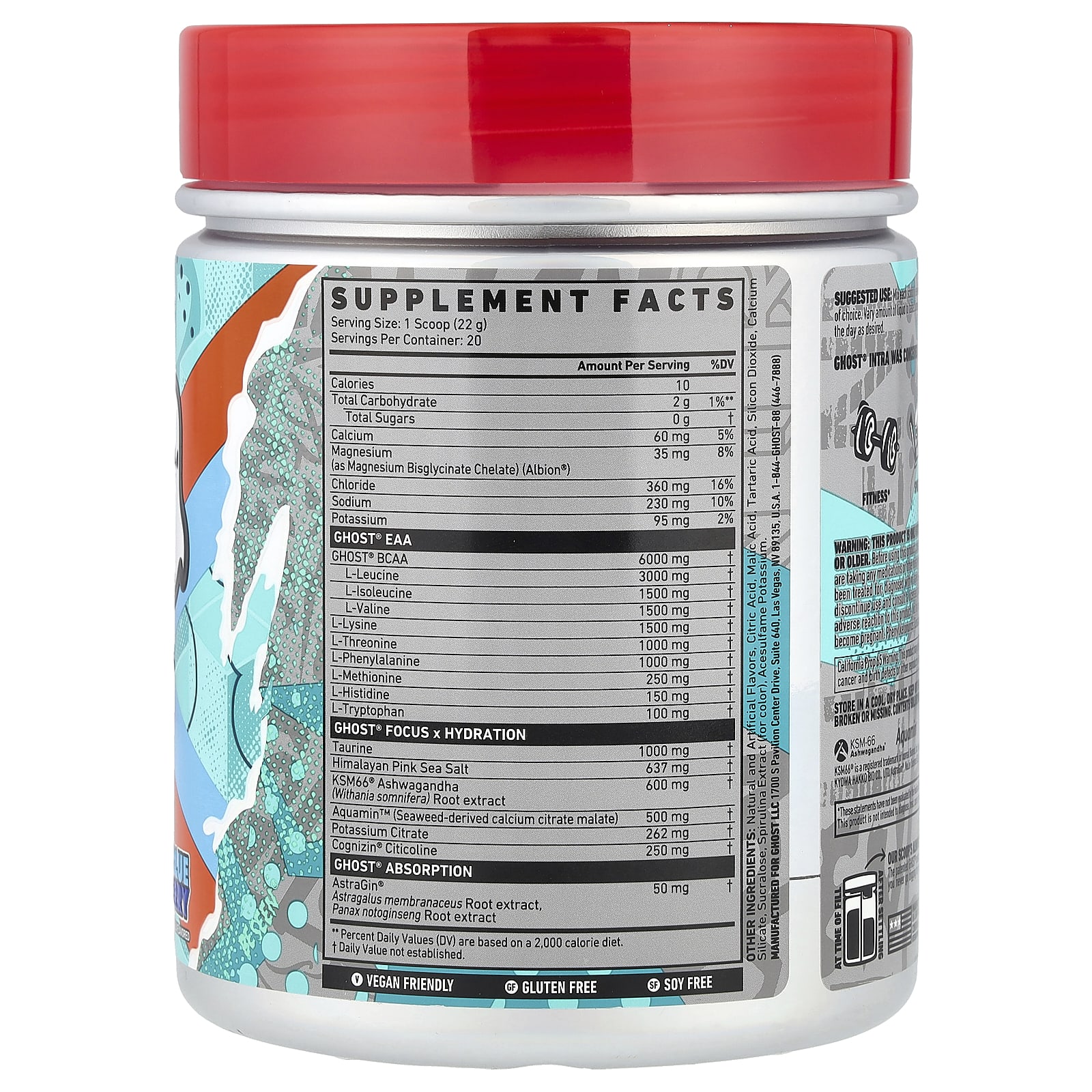 EAA, BCAA HydrationDietary SupplementNaturally and Artificially FlavoredVegan FriendlyGluten FreeSoy FreeKSM-66 Ashwagandha®Aquamin™Cognizin®AstraGin®Albion® MineralsGhost® Intra was conceived to sustain greatness at any hourFitnessSportParty AnytimeSustain Greatness at Any HourOur intra-workout POWERHOUSE. Packed with an EPIC 10G total EAAs per serving, plus Astragin® for absorption… oh yeah, and we threw in fully efficacious doses of Taurine, Cognizin® and KSM66® for an added focus and hydration play. Enjoy GHOST® INTRA with us around the clock. We sip ours at the gym, at the office and even with the squad before a night out.Our Scoop’s Always on TopThe patented GHOST® nested scoop ensures you never go digging fort your scoop again.