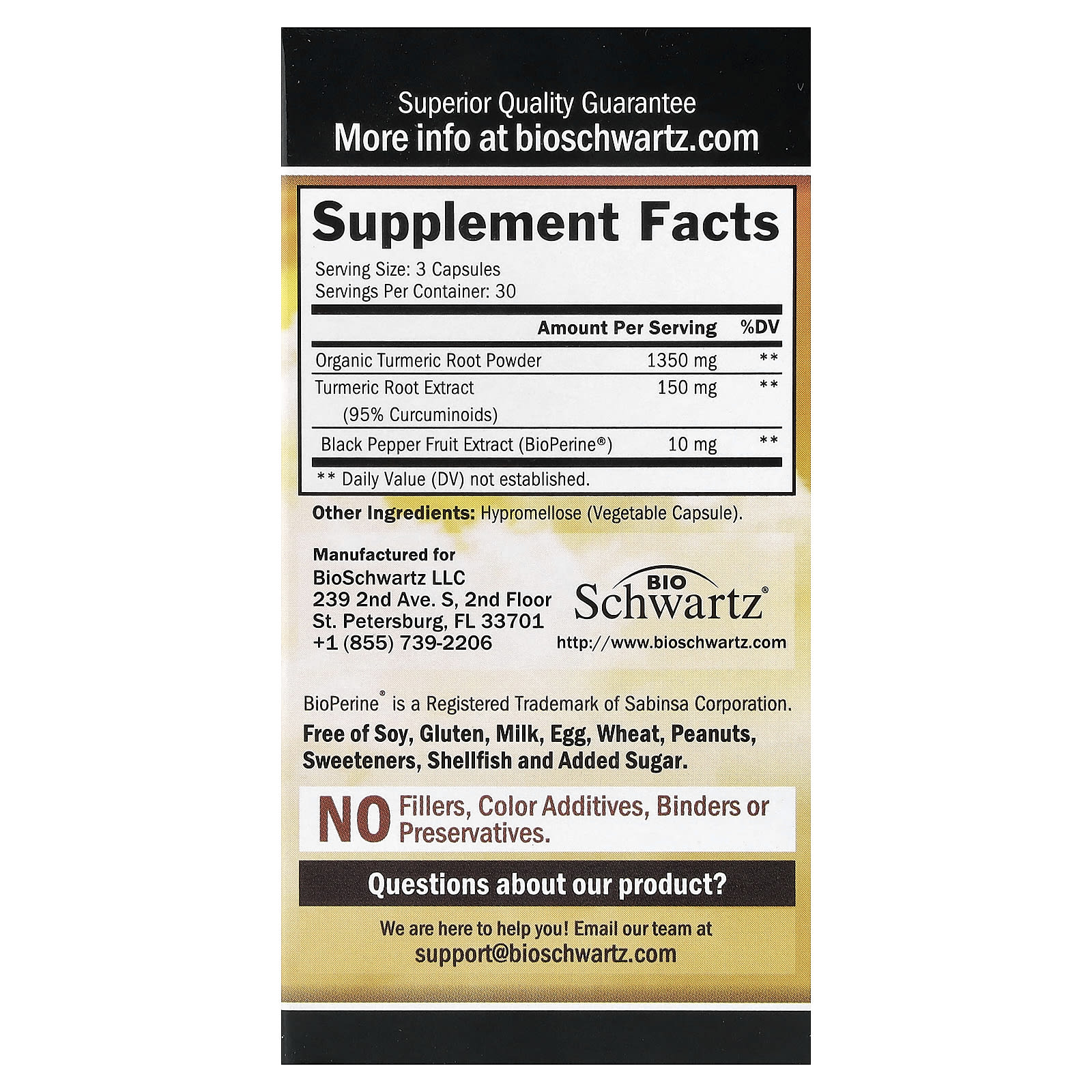 Professional Grade Premium QualityUltra Premium1500 mg Per ServingUltra High AbsorptionAccredited Third Party TestedVegan & Non-GMO IngredientsAllergen-Free + Gluten FreeFormulated by ProfessionalsSupports Joint HealthNon GMO Project Verified3rd Party GMP Certified Highest QualityDietary SupplementGMP – Good Manufacturing PracticeSuperior StandardsSafety, Knowledge, Quality, Commitment, IntegrityFormulated by ProfessionalsTurmeric Curcumin is one of Nature’s Best Kept Secrets What Makes Our Turmeric Better? Our premium supplements are produced from the finest raw materials and under stringent quality control standards to ensure the highest quality supplement is developed. Potent 1500 mg Turmeric CurcuminThis powerful formula has 1500 mg of Turmeric Curcumin per serving.Superior Absorption with BioPerine®Our formulation includes 10 mg of BioPerine® (Black Pepper Extract) per serving for enhanced absorption and bioavailability.Formulated by Professionals Each one of our professional grade supplements is created by a team of highly experienced professionals to ensure the greatest benefits are achieved.Non-GMO Project VerifiedWe adhere to North America’s most trusted third-party verification requirements for non-GMO food and products. Our Commitment to Quality “At BioSchwartz®, we create superior products through the perfect balance of the latest technologies, and the finest nutrients nature has to offer. We are committed to providing the highest quality supplements without the premium price tag.”We create superior products through the perfect balance of the latest technologies and the finest nutrients nature has to offer. We are committed to providing the highest quality supplements without the premium price tag. In regard to life’s normal stressors such as exercise or an occasional high-fat/high-calorie meal.