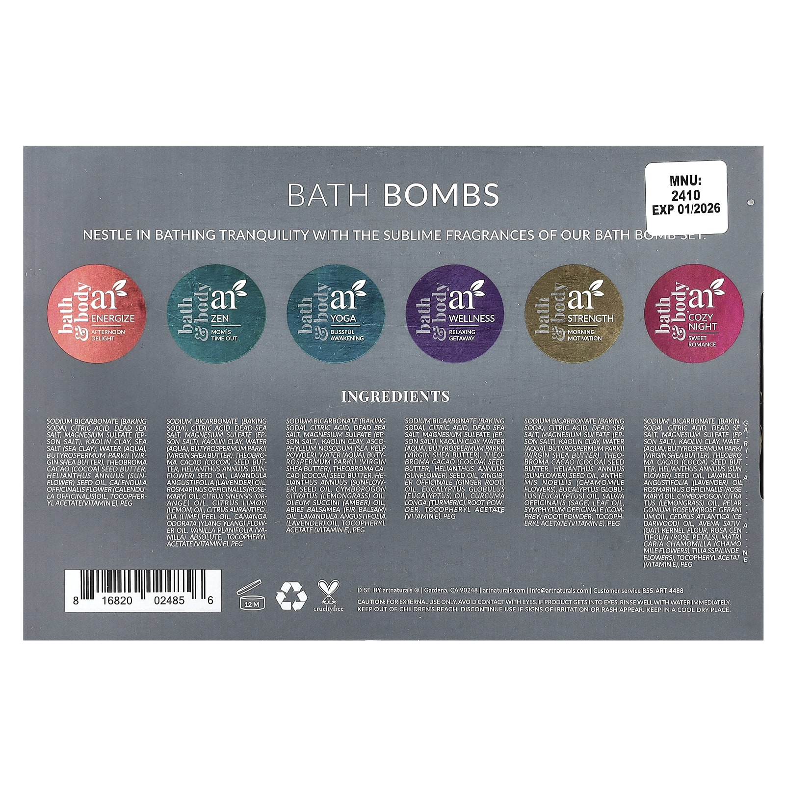 Nature’s BurstSoothing & MoisturizingCruelty FreeBath BombsEnergize – Afternoon DelightEmpoweringMotivatingAwakeningInvigoratingZen – Mom’s Time OutFocusingMind ClearingCenteringCalmingYoga – Blissful AwakeningRestoringEnrichingGroundingEnlighteningWellness – Relaxing GetawayInspiringUpliftingMood BoostingRefreshingStrength – Morning MotivationExhilaratingRenewingEnergizingActivatingCozy Night – Sweet RomanceSoothingEncouragingWarmingComfortingNestle in bathing tranquility with the sublime fragrances of our bath bomb set.