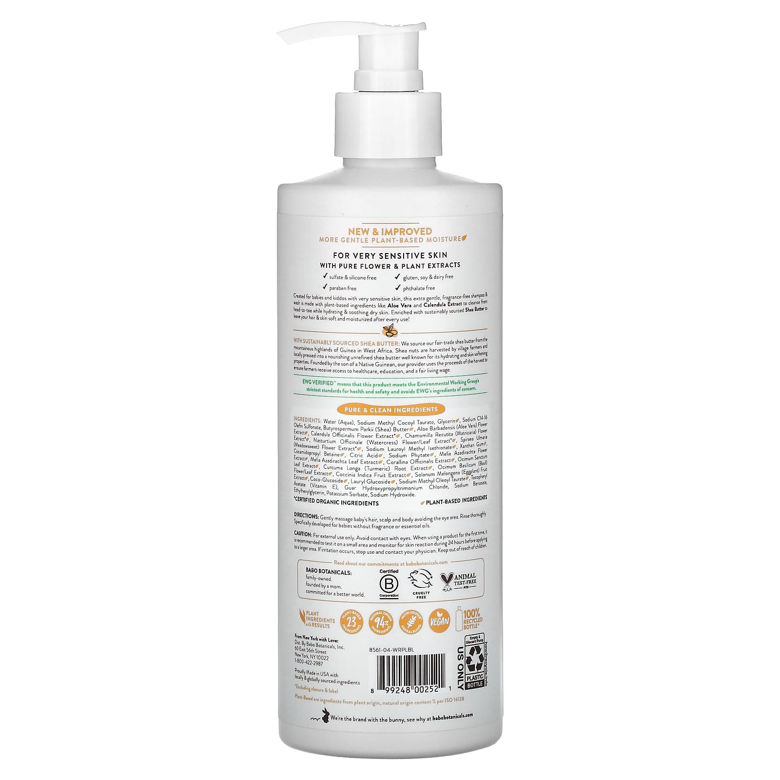 Soothing Shea Butter & Aloe VeraFor Dry & Very Sensitive SkinPediatrician TestedMore Gentle Plant-Based MoistureFor Very Sensitive SkinWith Pure Flower & Plant ExtractsSulfate & Silicone FreeParaben FreeGluten, Soy & Dairy FreePhthalate FreeCertified B CorporationLeaping Bunny Certified®; Cruelty-FreeAnimal Test-Free PETAWe’re The Brand with the BunnyCreated for babies and kiddos with very sensitive skin, this extra gentle, fragrance-free shampoo & wash is made with plant-based ingredients like Aloe Vera and Calendula Extract to cleanse from head-to-toe while hydrating & soothing dry skin. Enriched with sustainably sourced Shea Butter to leave your hair & skin soft and moisturized after every use! With sustainably sourced shea butter: We source our fair-trade shea butter from the mountainous highlands of Guinea in West Africa. Shea nuts are harvested by village farmers and locally pressed into a nourishing unrefined shea butter well known for its hydrating and skin softening properties. Founded by the son of a Native Guinean, our provider uses the proceeds of the harvest to ensure farmers receive access to healthcare, education, and a fair living wage.Babo Botanicals:Family owned. Founded by a mom.Committed fo a better world. Plant Ingredients with results23 Plant-based ingredients94% Natural origin ingredientsNutri-Soothe herbal blendedVeganPlant-Based are ingredients from plant origin, natural origin content % per ISO 16128EWG Verified™ means that this product meets the Environmental Working Group’s strictest standards for health and safety and avoids EWG’s ingredients of concern.