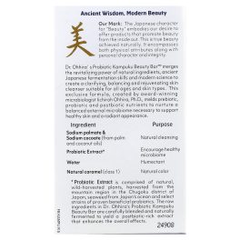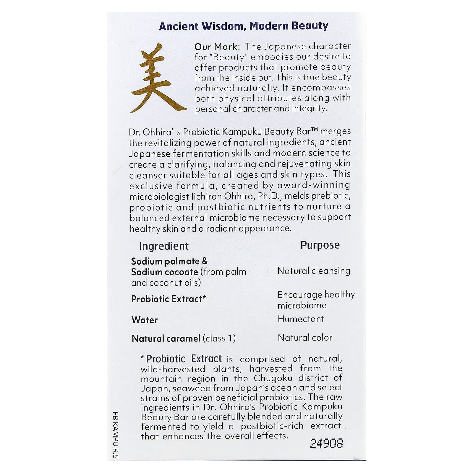 Promotes and Maintains Radiant Looking Skin Essential Formulas®Cruelty Free – This Product is Not Tested on AnimalsAncient Wisdom, Modern BeautyOur Mark: The Japanese character for “Beauty” embodies our desire to offer products that promote beauty from the inside out. This is true beauty achieved naturally. It encompasses both physical attributes along with personal character and integrity.Dr. Ohhira’s Probiotic Kampuku Beauty Bar™ merges the revitalizing power of natural ingredients, ancient Japanese fermentation skills and modern science to create a clarifying, balancing and rejuvenating skin cleanser suitable for all ages and skin types. This exclusive formula, created by award-winning microbiologist Iichiroh Ohhira, Ph.D., melds prebiotic, probiotic and postbiotic nutrients to nurture a balanced external microbiome necessary to support healthy skin and a radiant appearance.Suitable for daily use and appropriate for both face and body. Perfect for the entire family! Dr. Ohhira’s Probiotic Kampuku Beauty Bar™ offers natural deodorant benefits while leaving the skin clean and moisturized. Due to a traditional Japanese soap-making process that allows the moisturizing ingredients to evenly dissolve into the skin, the Kampuku Beauty Bar is also ideal for use when shaving the face, legs or other delicate areas while reducing painful and unsightly razor bumps.