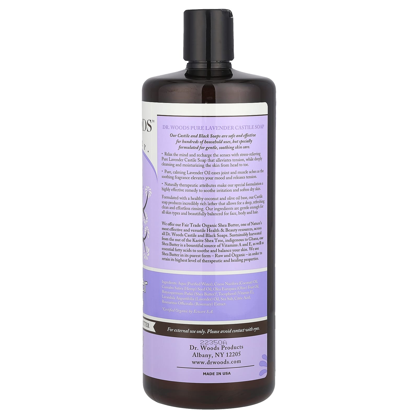 NaturallyAll Things GoodFor All Skin TypesMade With Fair Trade Shea ButterLeaping Bunny®; Cruelty Free100% Vegan & Gluten FreeParaben and Phthalate FreeLauryl/Laureth Sulfate FreeNo Petroleum DerivativesOur Castile and Black Soaps are safe and effective for hundreds of household uses, but specially formulated for gentle, soothing skin care.Relax the mind and recharge the senses with stress-relieving Pure Lavender Castile Soap that alleviates tension, while deeply cleansing and moisturizing the skin from head to toe.Pure, calming Lavender Oil eases joint and muscle aches as the soothing fragrance elevates your mood and releases tension.Naturally therapeutic attributes make our special formulation a highly effective remedy to soothe irritation and soften dry skin.Formulated with a healthy coconut and olive oil base, our Castile soap produces incredibly rich lather that allows for a deep, refreshing clean and effortless rinsing. Our ingredients are gentle enough for all skin types and beautifully balanced for face, body and hair.We offer our Fair Trade Organic Shea Butter, one of Nature’s most effective and versatile Health & Beauty resources, across all Dr. Woods Castile and Black Soaps. Sustainably harvested from the nut of the Karite Shea Tree, indigenous to Ghana, our Shea Butter is a bountiful source of Vitamins A and E, as well as essential fatty acids to soothe and balance your skin. We use Shea Butter in its purest form – Raw and Organic – in order to retain its highest level of therapeutic and healing properties.All Things Good For Our Family… And Yours.Dr. Woods is a family business born from our own passionate quest to produce the finest and most effective Health & Beauty products in the world. Our family is wonderfully diverse with different ages, skin types, hair textures and styling needs, so creating truly healthy, highly effective products that work for all of us was an inspiring challenge… and with diligence, creativity and lots of love, we created the most beneficial and environmentally sustainable products available.Dr. Woods draws on the very best time-tested healing traditions together with modern formulation processes. We choose to keep our products as natural as possible, without compromising effectiveness, using the best pure ingredients from around the world and never containing dangerous chemical additives or harsh detergents that strip away your skin’s natural elasticity. We’ve also worked incredibly hard to make our products truly affordable so good health and exceptional quality are accessible to everyone.Our family is deeply proud of the products we make and it is a great honor to share them with yours.