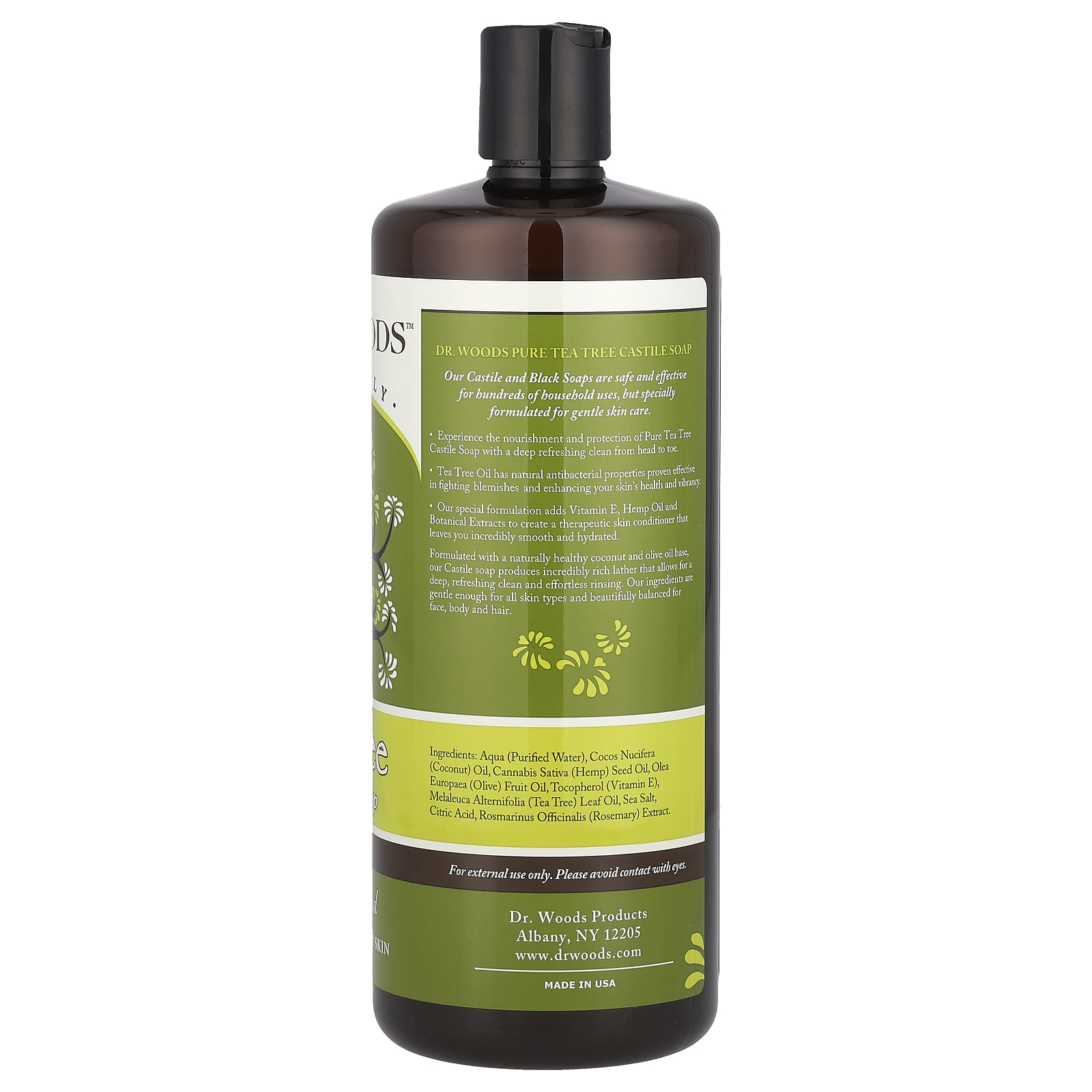 NaturallyAll Things GoodFor Normal to Oily SkinGluten FreeLeaping Bunny®; Cruelty-Free100% VeganGluten FreeParaben and Phthalate FreeLauryl / Laureth Sulfate FreeNo Petroleum DerivativesOur Castile and Black Soaps are safe and effective for hundreds of household uses, but specially formulated for gentle skin care.Experience the nourishment and protection of Pure Tea Tree Castile Soap with a deep refreshing clean from head to toe.Tea Tree Oil has natural antibacterial properties proven effective in fighting blemishes and enhancing your skin’s health and vibrancy.Our special formulation adds Vitamin E, Hemp Oil and Botanical Extracts to create a therapeutic skin conditioner that leaves you incredibly smooth and hydrated.Formulated with a naturally healthy coconut and olive oil base, our Castile soap produces incredibly rich lather that allows for a deep, refreshing clean and effortless rinsing. Our ingredients are gentle enough for all skin types and beautifully balanced for face, body and hair.All Things Good – For Our Family… And Yours.Dr. Woods is a family business born from our own passionate quest to produce the finest and most effective Health & Beauty products in the world. Our family is wonderfully diverse with different ages, skin types, hair textures and styling needs, so creating truly healthy, highly effective products that work for all of us was an inspiring challenge… and with diligence, creativity and lots of love, we created the most beneficial and environmentally sustainable products available.Dr. Woods draws on the very best time-tested healing traditions together with modern formulation processes. We choose to keep our products as natural as possible, without compromising effectiveness, using the best pure ingredients from around the world and never containing dangerous chemical additives or harsh detergents that strip away your skin’s natural elasticity. We’ve also worked incredibly hard to make our products truly affordable so good health and exceptional quality are accessible to everyone.Our family is deeply proud of the products we make and it is a great honor to share them with yours.