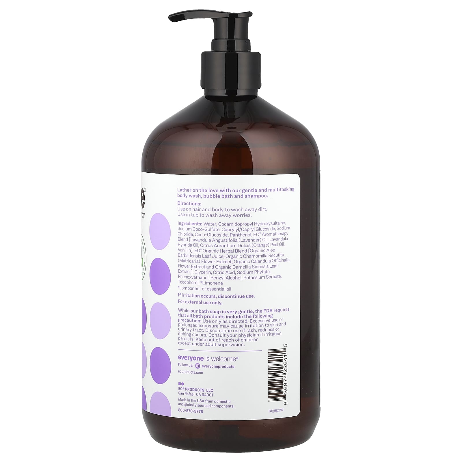 Water, cocamidopropyl hydroxysultaine, sodium coco-sulfate, caprylyl/capryl glucoside, sodium chloride, coco-glucoside, panthenol, EO® aromatherapy blend [lavandula angustifolia (lavender) oil, lavandula hybrida oil, citrus aurantium dulcis (orange) peel oil, vanillin], EO® organic herbal blend [organic aloe barbadensis leaf juice, organic chamomilla recutita (matricaria) flower extract, organic calendula officinalis flower extract and organic camellia sinensis leaf extract], glycerin, citric acid, sodium phytate, phenoxyethanol, benzyl alcohol, potassium sorbate, tocopherol, *limonene.*Component of essential oilMade in the USA from domestic and globally sourced components.