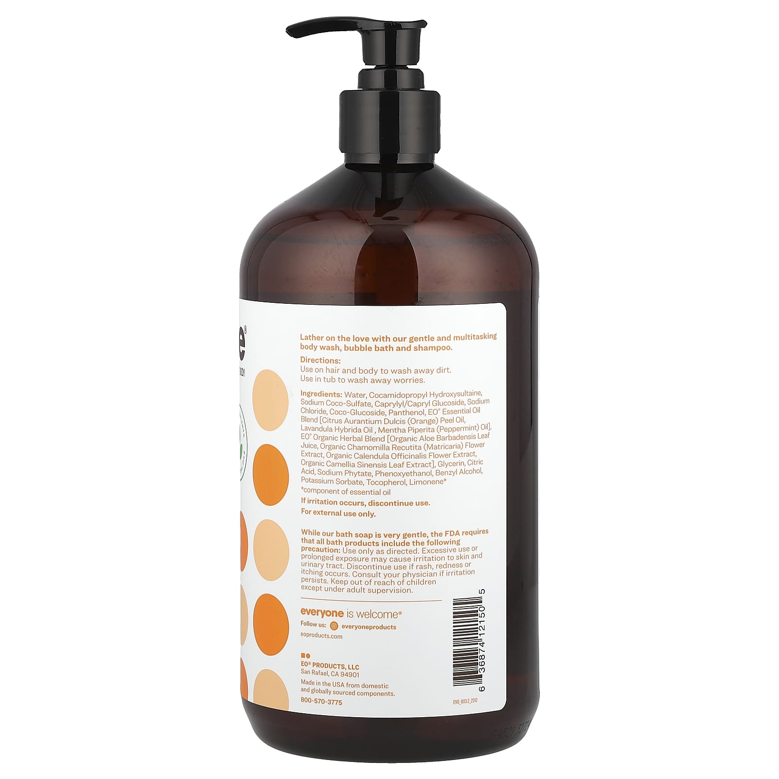 Water, cocamidopropyl hydroxysultaine, sodium coco-sulfate, caprylyl/capryl glucoside, sodium chloride, coco-glucoside, panthenol, EO® essential oil blend [citrus aurantium dulcis (orange) peel oil, lavandula hybrida oil , mentha piperita (peppermint) oil], EO® organic herbal blend [organic aloe barbadensis leaf juice, organic chamomilla recutita (matricaria) flower extract, organic calendula officinalis flower extract, organic camellia sinensis leaf extract], glycerin, citric acid, sodium phytate, phenoxyethanol, benzyl alcohol, potassium sorbate, tocopherol, limonene.**Component of essential oil.Made in the USA from domestic and globally sourced components.