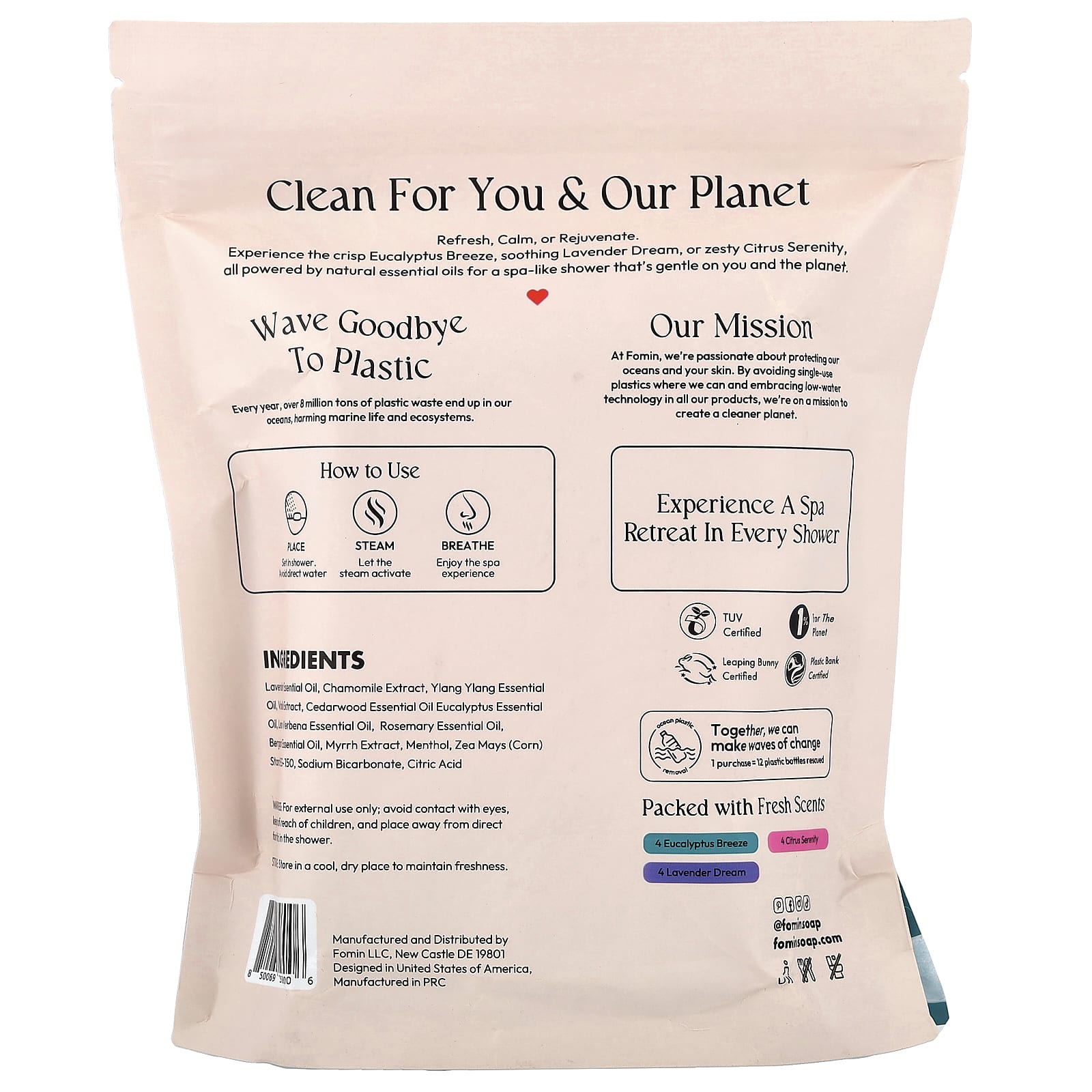 Bio-DegradableEco-FriendlyWith Natural Essential OilsExperience a Spa Retreat in Every ShowerTUV CertifiedLeaping Bunny®; Cruelty FreePlastic Bank CertifiedOcean Plastic RemovalPacked with Fresh Scents:4 Eucalyptus Breeze4 Lavender Dream4 Citrus SerenityClean For You & Our Planet Refresh, Calm, or Rejuvenate. Experience the crisp Eucalyptus Breeze, soothing Lavender Dream, or zesty Citrus Serenity. all powered by natural essential oils for a spa-like shower that’s gentle on you and the planet.Wave Goodbye To Plastic Every year, over 8 million tons of plastic waste end up in our oceans, harming marine life and ecosystems.Our Mission At Fomin, we’re passionate about protecting our oceans and your skin. By avoiding single-use plastics where we can and embracing low-water technology in all our products, we’re on a mission to create a cleaner planet.