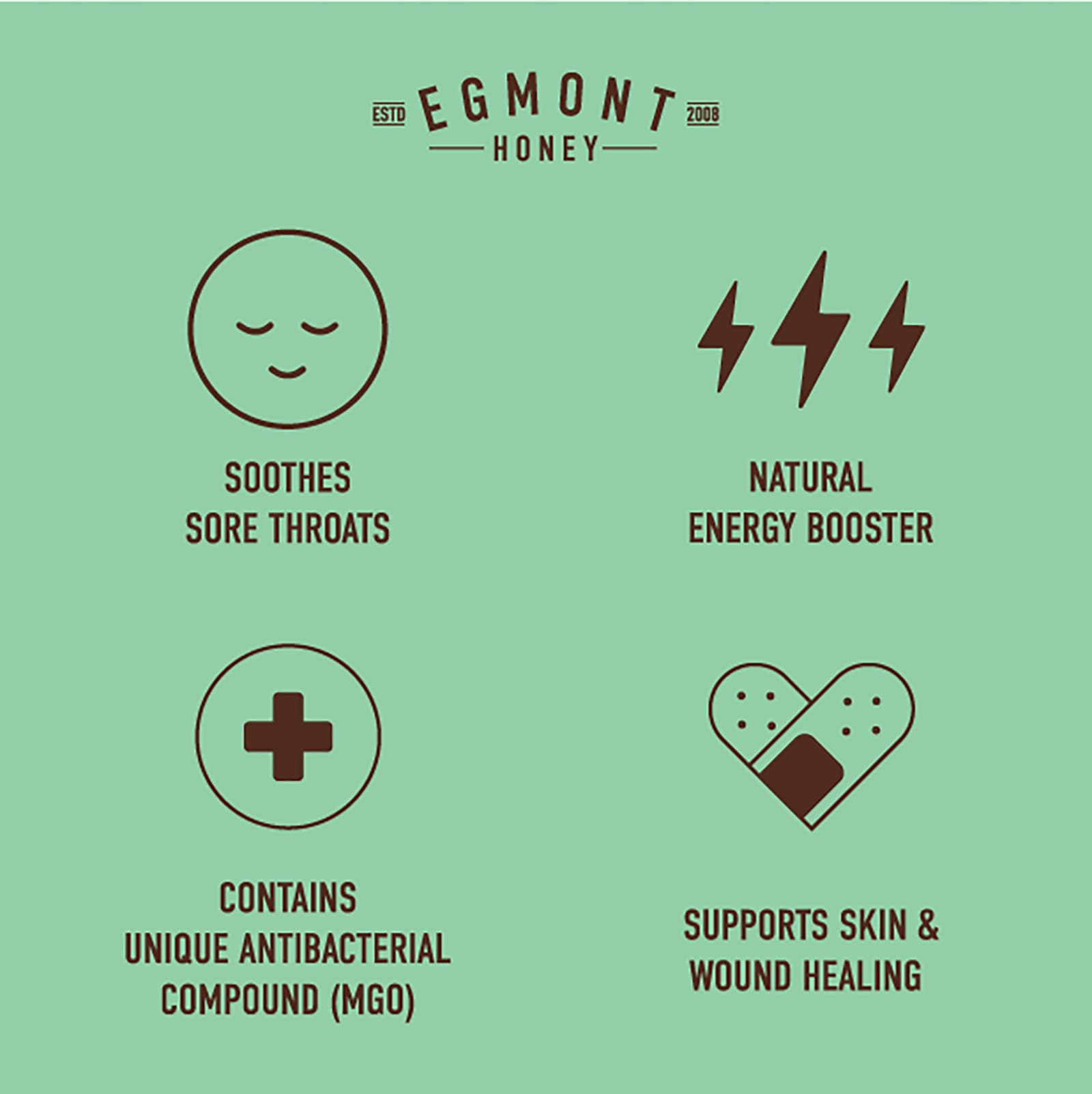 VitalityNon GMO Project VerifiedBPA FreeHalalKosher KiwiSoothes the ThroatGeneral Wellness SupportA Natural Daily BoostEgmont Manuka Honey is based under Mount Taranaki, a volcano that defines the region. Our Manuka Honey is produced by bees collecting nectar from the Manuka plant that grows wildly in New Zealand. Nothing to hide; nothing but nature. Certified MGO ensures this honey contains at least 265mg/kg of methylglyoxal as tested by an IANZ approved laboratory. The UMF™ rating system independently certifies natural components found in Manuka Honey to assure potency, purity, authenticity, & freshness.