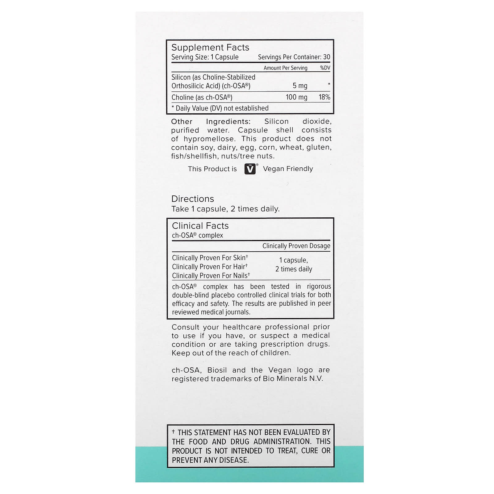 Take 1 capsule, 2 times daily.Clinical Factsch-OSA® complexClinical Proven DosageClinically Proven For SkinClinically Proven For HairClinically Proven For Nails1 capsule, 2 times dailych-OSA® complex has been tested in rigorous double-blind placebo controlled clinical trials for both efficacy and safety. The results are published in peer reviewed medical journals.