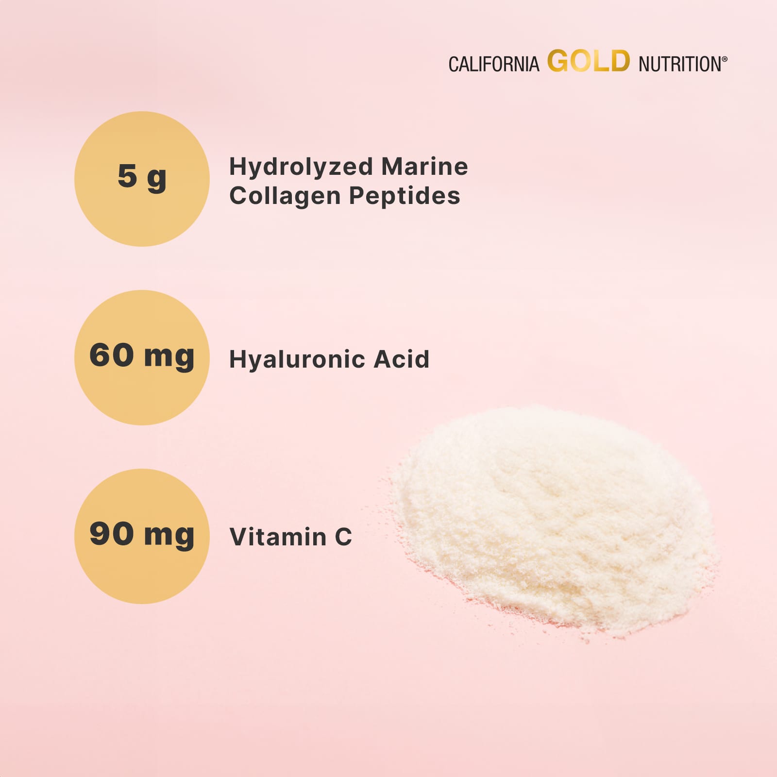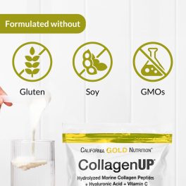 Marine Sourced Collagen Peptides + Hyaluronic Acid + Vitamin CFeaturing Unflavored, Non-Bovine, Hydrolyzed Fish Collagen With Non-Animal Source Hyaluronic Acid and Vitamin CSupport for Healthy Hair, Skin, Nails, Joints and Bones*Enzymatically Hydrolyzed Collagen Broken Down into Bioavailable PeptidesCalifornia Gold Nutrition® CollagenUP®, 16.37 oz (464 g) contains ingredients to help support healthy hair, skin, nails, joints, and bones.* The unflavored powder can be quickly added to your favorite drink, providing a convenient way to add collagen to your diet.iTested Verified