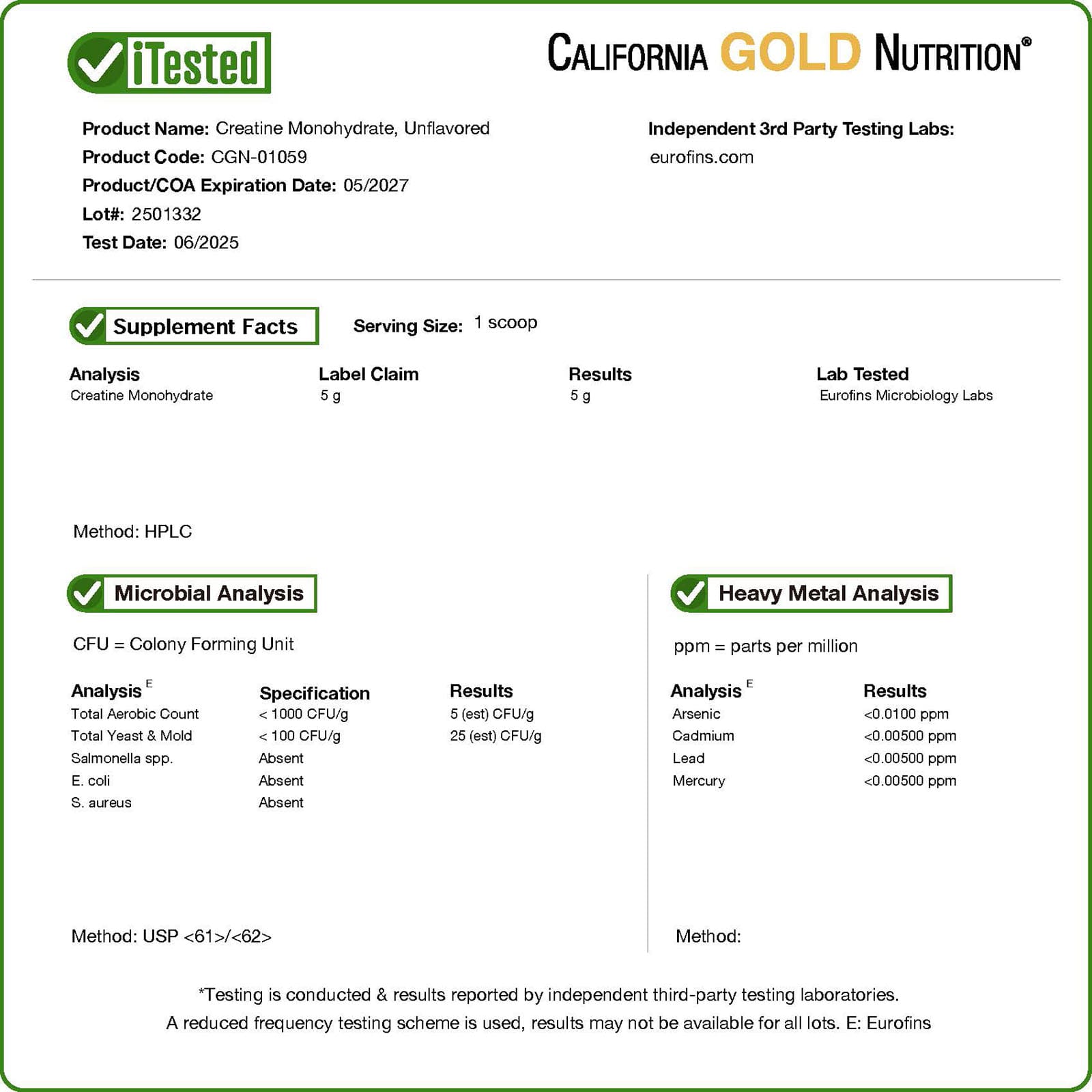 5 g Creatine Monohydrate per ServingUnflavored PowderCalifornia Gold Nutrition® Sport Creatine powder can be added to Electrolyte/Hydration/Endurance Beverages, Protein Shakes, Meal Replacement Powders, Weight Gainers or Smoothies. Studies suggest that creatine can help to increase lean muscle mass, reduce muscle fatigue and enhance physical or athletic performance.*iTested Verified