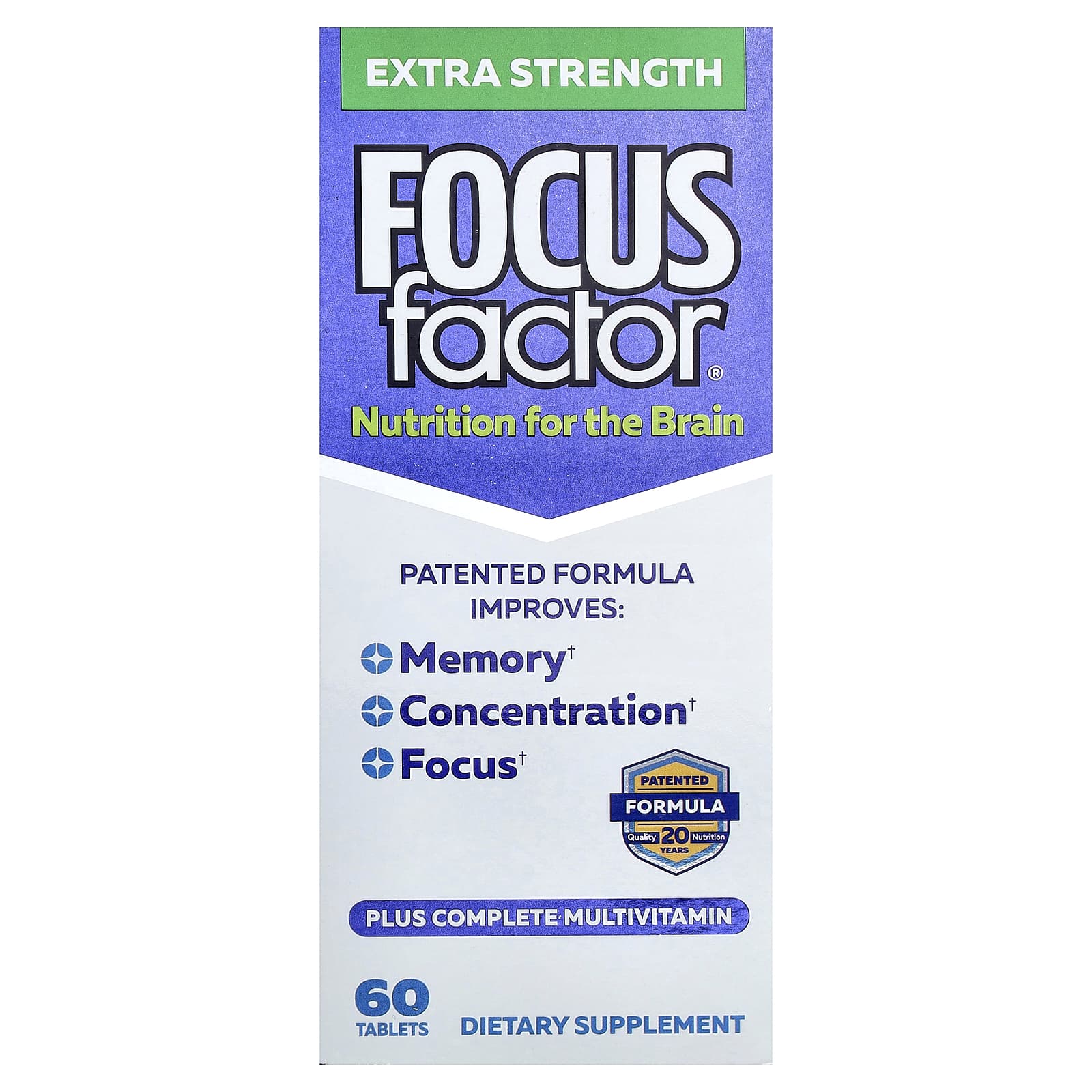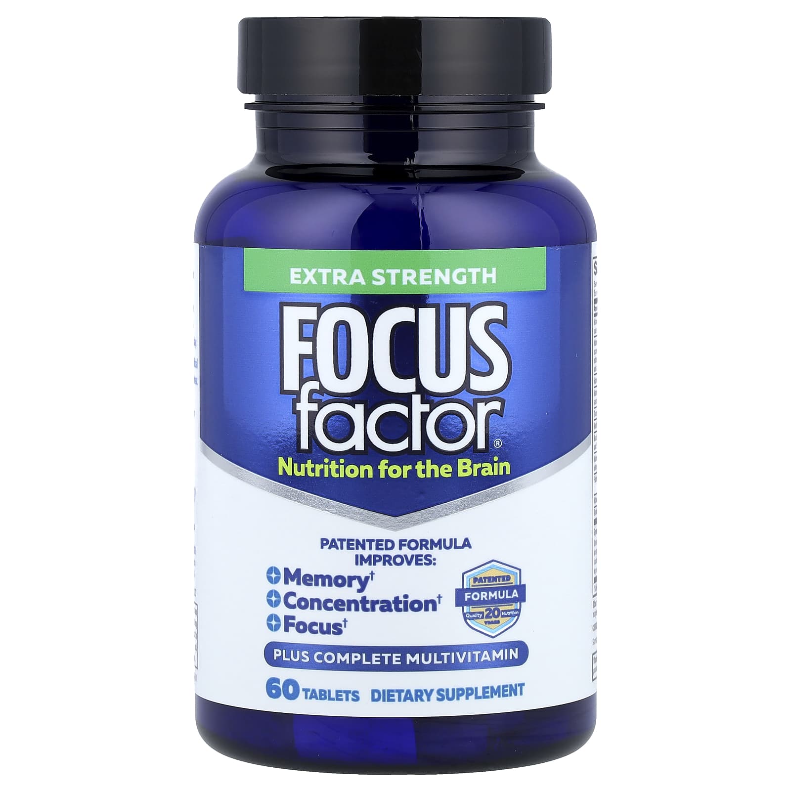 Extra StrengthPatented Formula Quality Nutrition 20 Years Plus Complete Multivitamin Dietary Supplement Synergy Patented Formula Improves: MemoryConcentration FocusTake Charge of Your Brain Health FOCUSfactor® Extra Strength is an advanced formulation that takes our original, clinically tested FOCUSfactor® formula which has been shown to improve memory, concentration and focus and increases the level of key selected neuronutrients. So go ahead and nourish that amazing, hard-working brain with a powerful, patented formula.Have You Nourished Your Brain Today? Like other parts of your body, your brain needs proper nutrition to perform at its best. Staying focused and on top of your game at work, home, and school is more essential than ever. So, join the millions of people across the country that have made the decision to start actively caring for their brain health with FOCUSfactor®.