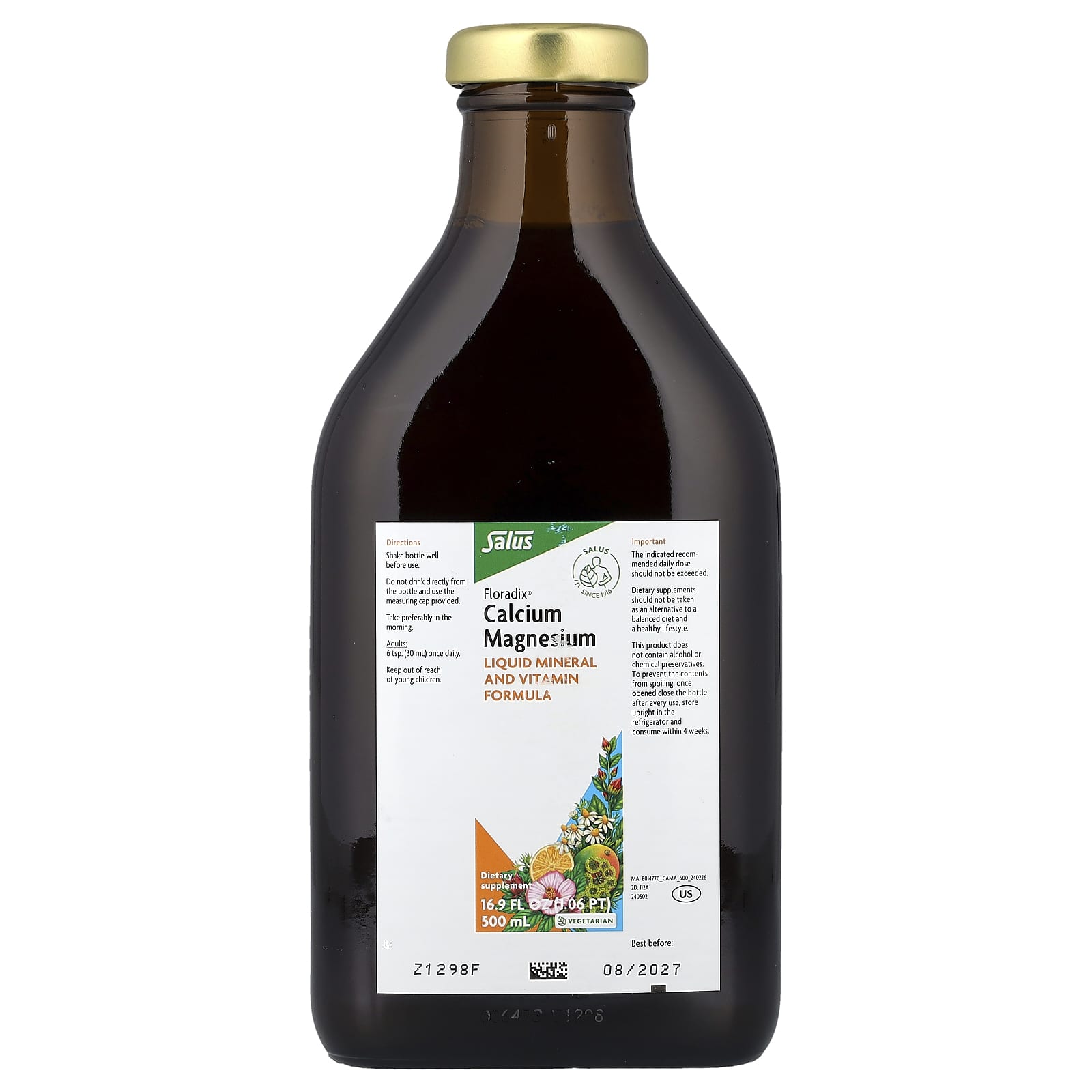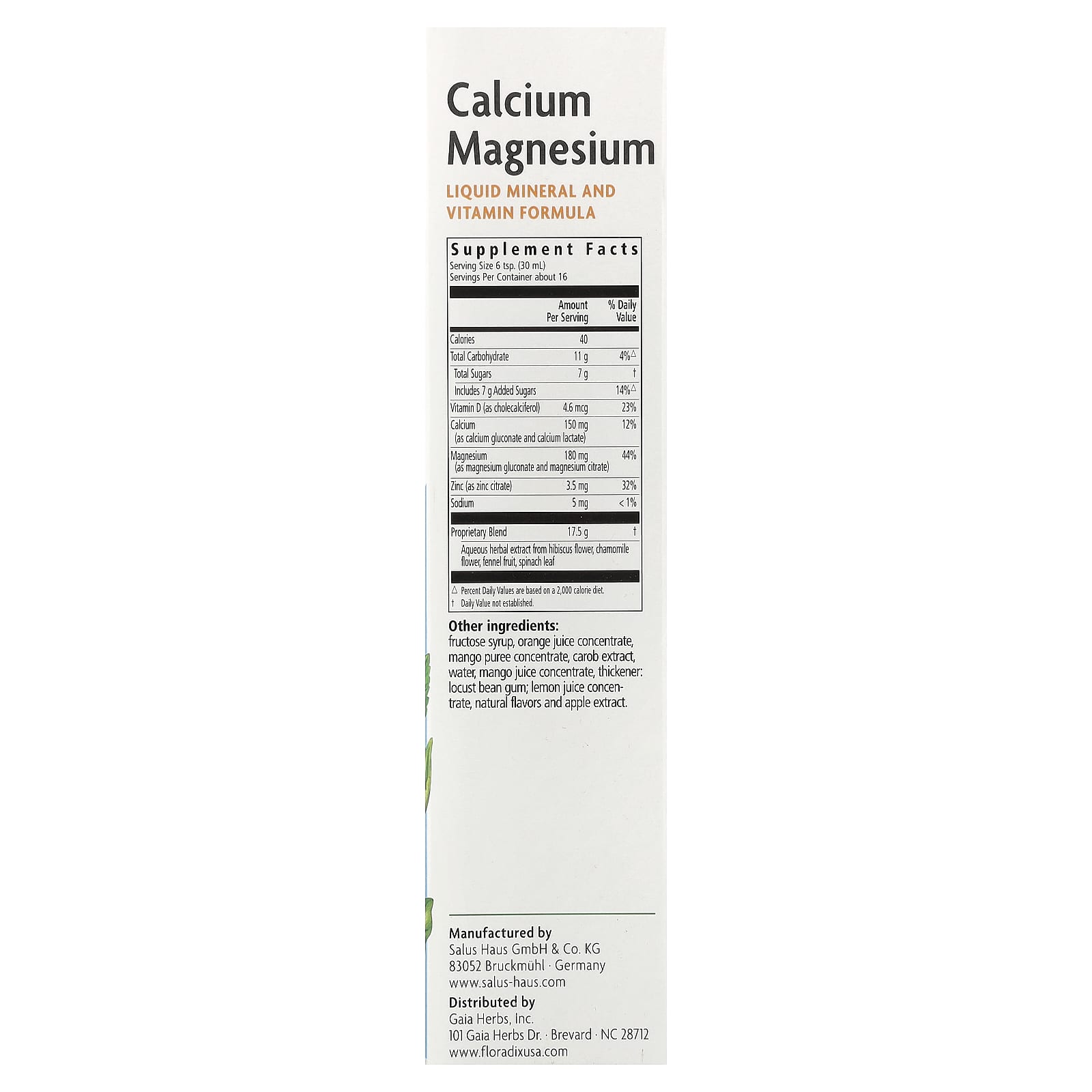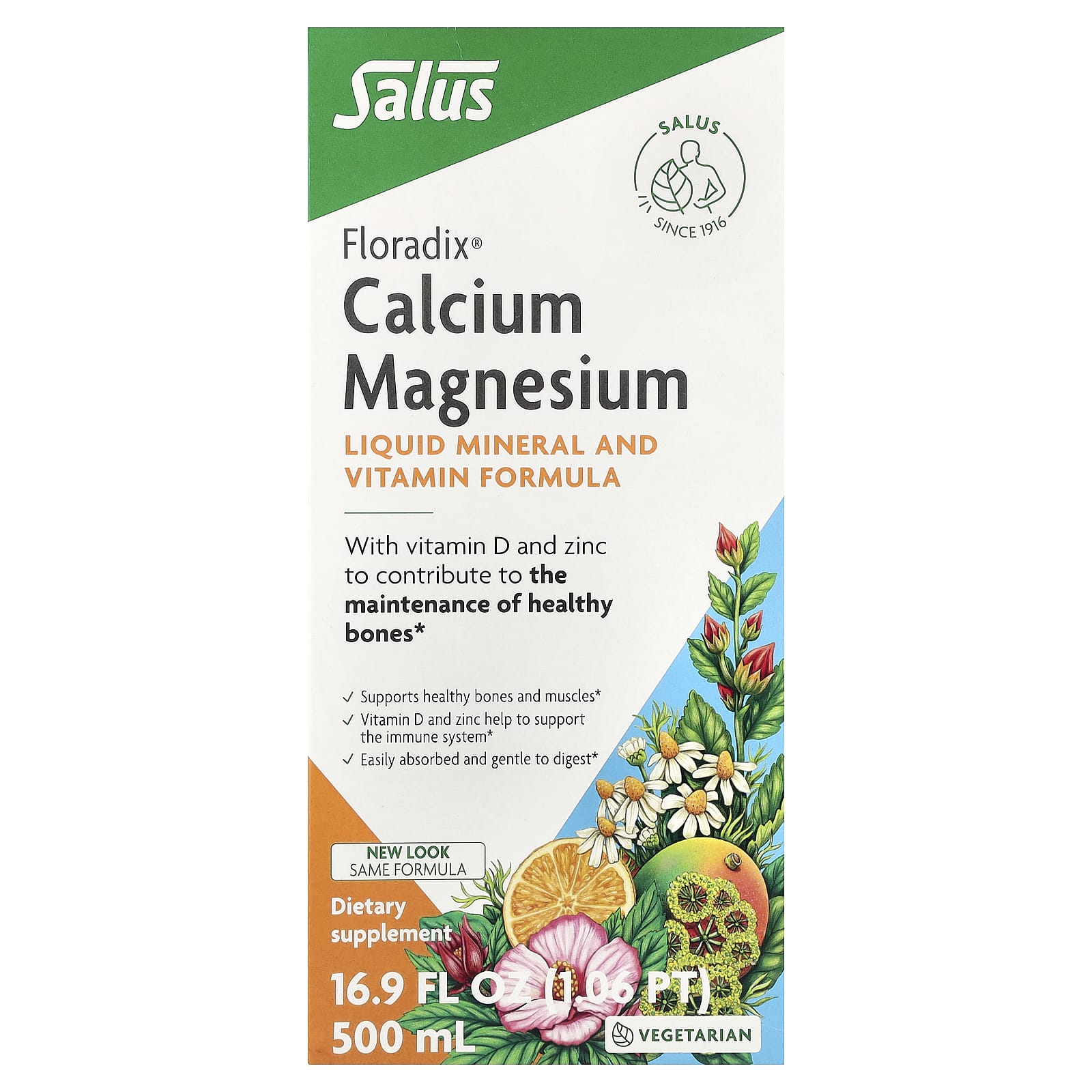 Since 1916Liquid Mineral and Vitamin FormulaSupports Healthy Bones and MusclesVitamin D and Zinc Helps to Support the Immune SystemEasily Absorbed and Gentle to DigestDietary SupplementVegetarianNo AlcoholNo PreservativesNo ColoringsGluten FreeWith vitamin D and zinc to contribute to the maintenance of healthy bones.Calcium, magnesium, vitamin D and zinc contribute to the maintenance of normal bones.Calcium, magnesium and vitamin D also contribute to the maintenance of normal muscle function and teeth. Furthermore, vitamin D supports the calcium absorption.Floradix Calcium Magnesium is easy to take and helps safeguard the balance of calcium, magnesium, zinc and vitamin D. As these nutrients are already dissolved, they are absorbed more quickly by the digestive system compared to tablets. Floradix Calcium Magnesium contains selected herbs and several fruit juice concentrates for a pleasant taste. Floradix Calcium Magnesium is particularly beneficial for women, adolescents, the elderly, sportsmen and -women and for people lacking these nutrients in their diet. About Salus Since the foundation of Salus Haus in 1916, the utmost importance has been placed on the careful selection of ingredients for our products. At Salus we do not use genetically modified raw materials. We combine nature with innovation and quality, developing new products with the use of state-of- the-art analytical methods in our laboratories. Salus applies the highest quality standards in Europe by carefully controlling the production of raw materials and finished products.