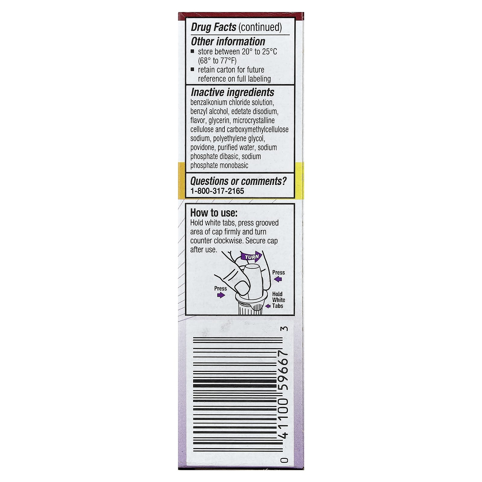 Drug FactsActive IngredientPurposeOxymetazoline hydrochloride 0.05% Nasal decongestantInactive IngredientsBenzalkonium chloride solution, benzyl alcohol, edetate disodium, flavor, glycerin, microcrystalline cellulose and carboxymethylcellulose sodium, polyethylene glycol, povidone, purified water, sodium phosphate dibasic, sodium phosphate monobasic.