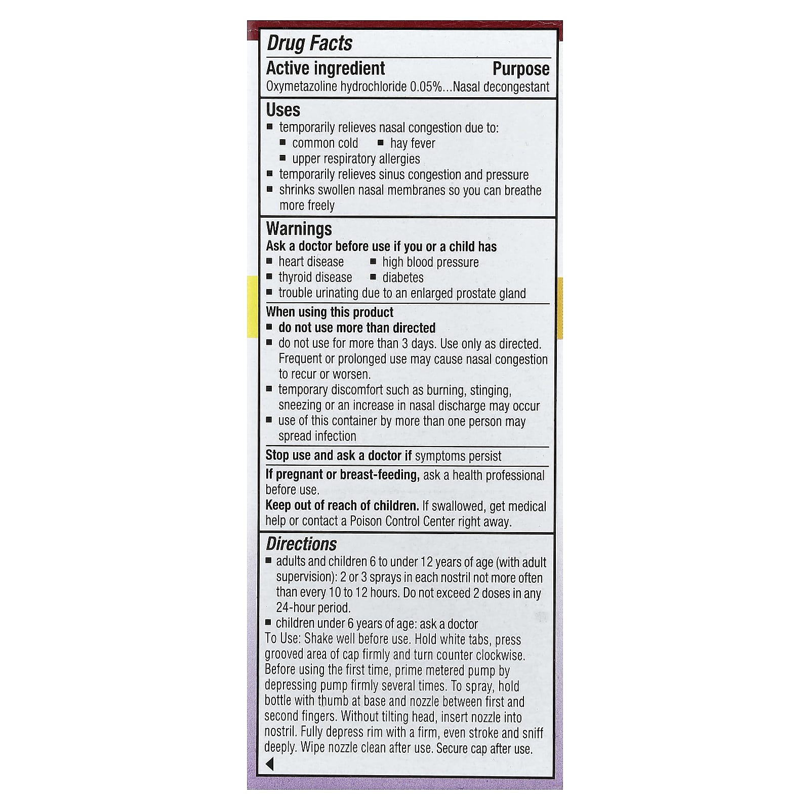 Ask a doctor before use if you or a child has:heart diseasehigh blood pressurethyroid diseasediabetestrouble urinating due to an enlarged prostate glandWhen using this productDo not use more than directed.Do not use for more than 3 days. Use only as directed. Frequent or prolonged use may cause nasal congestion to recur or worsen.Temporary discomfort such as burning, stinging, sneezing or an increase in nasal discharge may occurUse of this container by more than one person may spread infectionStop use and ask a doctor if symptoms persist.If pregnant or breast-feeding, ask a health professional before use.Keep out of reach of children. If swallowed, get medical
