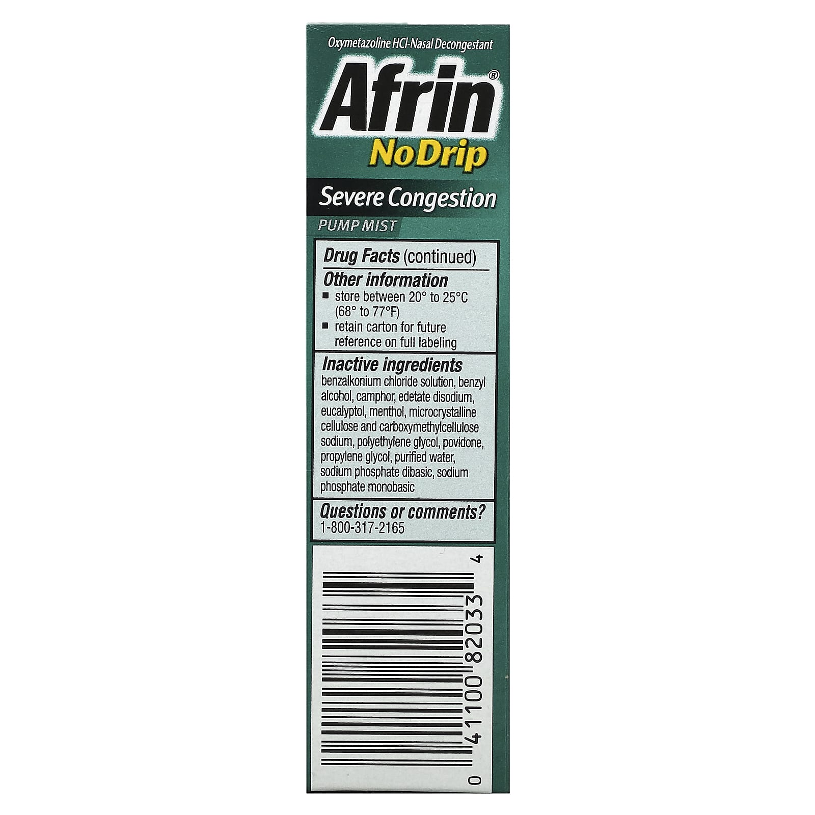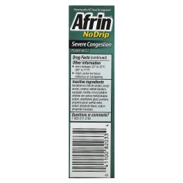 Oxymetazoline HCl Nasal Solution-Nasal DecongestantWon’t Drip from Nose or Down ThroatFast, Powerful Congestion ReliefColds, AllergiesUp to 12 Hour ReliefMaximum Strength Plus Menthol#1 Doctor & Pharmacist Recommended Nasal Spray BrandRelief Lasts All-Day or All-NightAfrin® No Drip is a breakthrough in nasal sprays. It stays where you spray it without messy dripping from your nose or down your throat. It is a maximum strength formula with the aromatic power of menthol. It starts to work in seconds providing up to 12 hours of nasal congestion relief without drowsiness. Uses:Temporarily relieves nasal congestion due to : common cold, hay fever, upper respiratory allergiesTemporarily relieves sinus congestion and pressureShrinks swollen nasal membranes so you can breath more freely