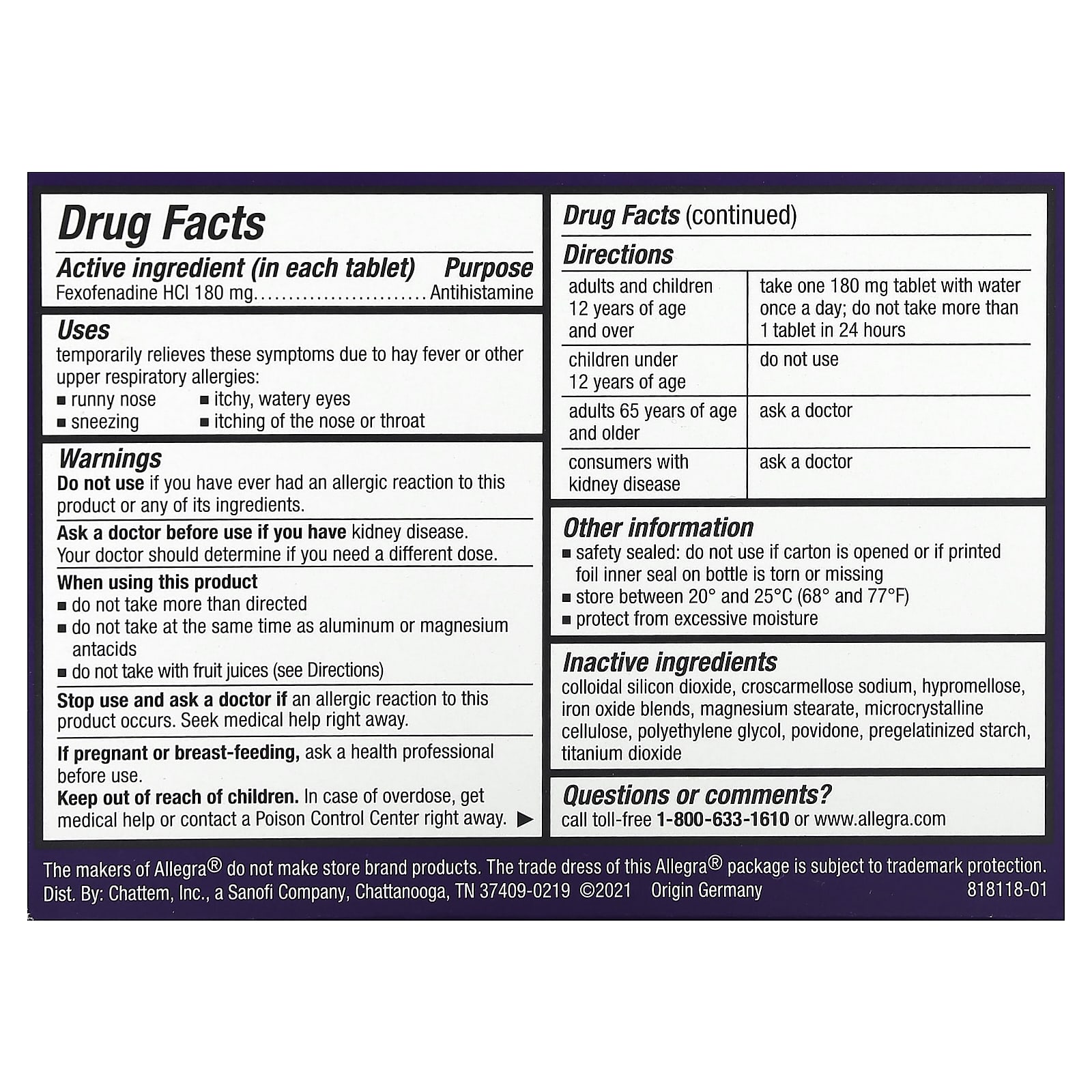 Fexofenadine HCl tablet 180 mg/Antihistamine Indoor/Outdoor Allergy ReliefUses:Temporarily relieves these symptoms due to hay fever or other upper respiratory allergies:Runny NoseItchy, Watery EyesSneezingItchy Nose or Throat