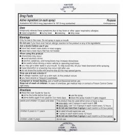 Only for use in the nose. Do not spray in eyes or mouth.Do not use if you have ever had an allergic reaction to this product or any of its ingredientsAsk a doctor before use if youhave had recent nose ulcers or nose surgeryhave had a nose injury that has not healedWhen using this productdrowsiness may occuravoid alcoholic drinksalcohol, sedatives, and tranquilizers may increase drowsinessbe careful when driving a motor vehicle or operating machineryyou may get a bitter taste in your mouth. To help avoid this, tilt your head downward while spraying.nasal discomfort or sneezing may occur right after usedo not share this bottle with anyone else as this may spread germsStop use and ask a doctor ifan allergic reaction, such as a skin rash, to this product occursyou have severe or frequent nosebleedsIf pregnant or breast-feeding, ask a health professional before use.Keep out of reach of children. In case of overdose, get medical help or contact a Poison Control Center