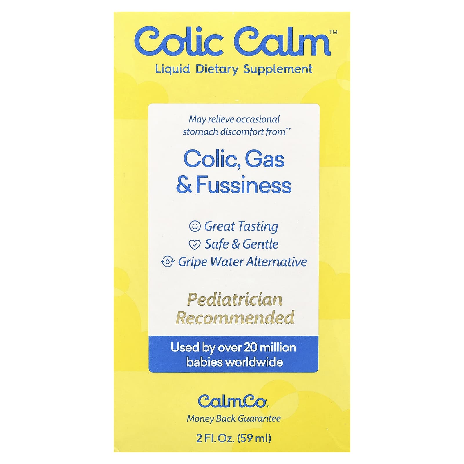 Liquid Dietary SupplementGreat TastingSafe & GentleGripe Water AlternativePediatrician RecommendedUsed by Over 20 Million Babies Worldwide CalmCo®May relieve occasional stomach discomfort from+ colic, gas & fussiness.+For colic that’s not due to a medical condition.