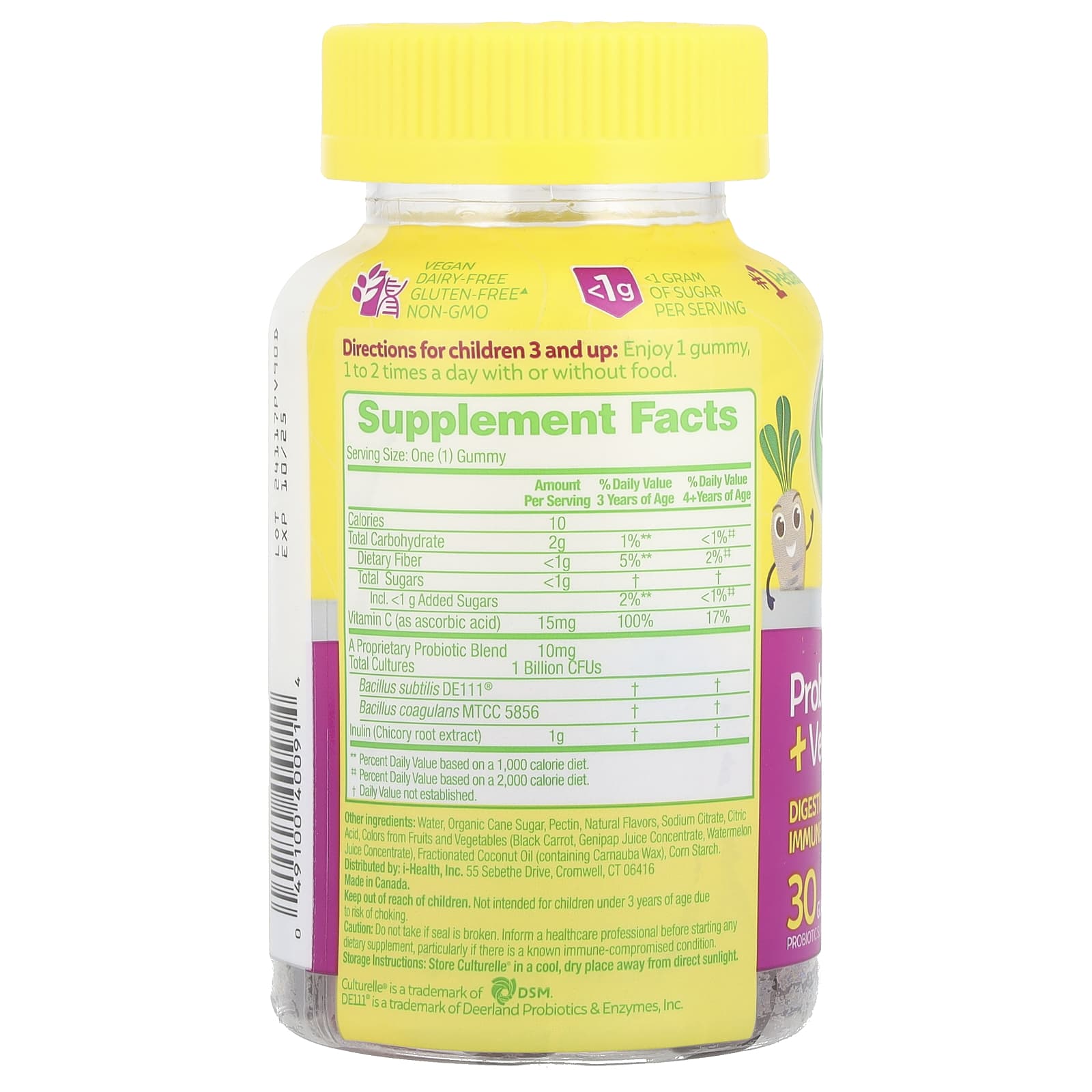 From the #1 Pediatrician Recommended Brand♦Vitamin C BoostDigestive & Immune SupportProbiotic SupplementBerry Blast Flavor With Other Natural Flavors1 Billion CFUs of Good BacteriaNatural FlavorsVeganDairy FreeGluten Free▴Non GMO<1 Gram of Sugar Per ServingYour Kid's Gut Microbiome is Essential to Their Overall Health.The bacteria that live in the gut are linked to digestive health, cognition, mood and immune health. Factors like their diet, medications and environment can disrupt a kid's microbiome, which can lead to a host of issues.Probiotics have the power to positively impact your kid's health by promoting a natural balance of good bacteria in their microbiome:The unique probiotic strains in Culturelle® Kids Probiotic + Veggie Fiber Gummies were specifically selected to ensure great taste, texture & efficacy.Trust Your Kid's Gut to Culturelle®All Culturelle® products contain probiotic strains that work through expiration.♦Based on a 2020 survey among pediatricians recommending a probiotic brand.▲Meets the FDA's guidelines for gluten-free.