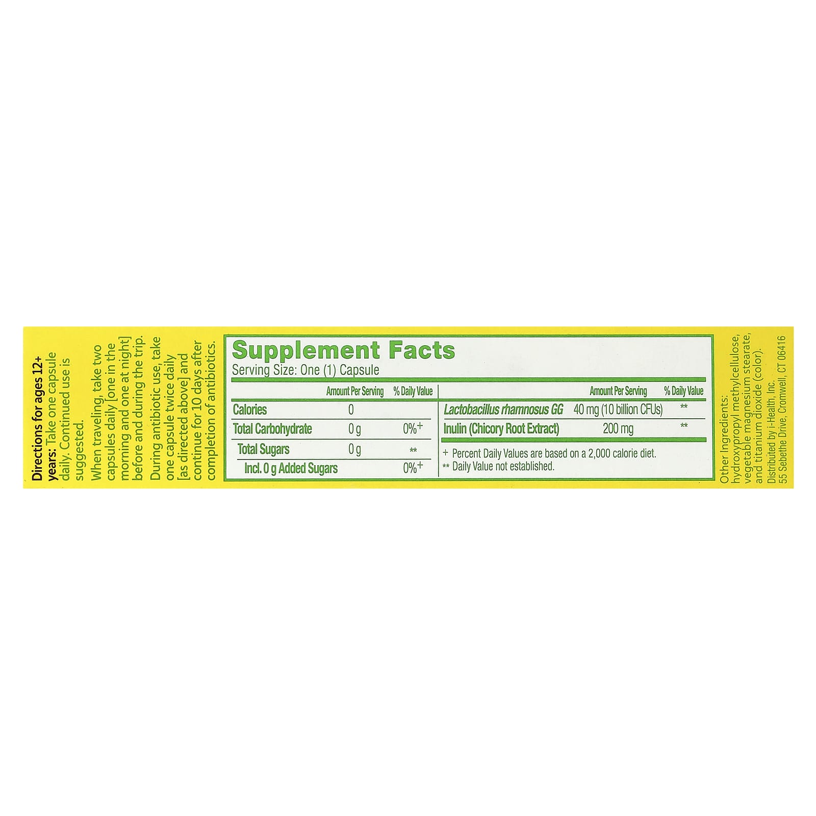 years: Take one capsule daily. Continued use is suggested.When traveling, take two capsules daily [one in the morning and one at night] before and during the trip.During antibiotic use, take