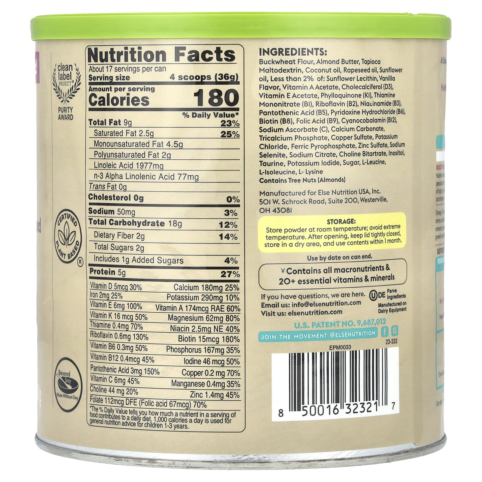 Buckwheat flour, almond butter, tapioca maltodextrin, coconut oil, rapeseed oil, sunflower oil, less than 2% of: sunflower lecithin, vanilla flavor, vitamin aacetate, cholecalciferol (d3), vitamin e acetate, phylloquinone (ki), thiamine mononitrate (bi), riboflavin (b2), niacinamide (b3), pantothenic acid (b5), pyridoxine hydrochloride (b6), biotin (b8), folic acid (b9), cyanocobalamin (bi2), sodium ascorbate (c), calcium carbonate, tricalcium phosphate, copper sulfate, potassium chloride, ferric pyrophosphate, zinc sulfate, sodium selenite, sodium citrate, choline bitartrate, inositol, taurine, potassium lodide, sugar, l-leucine, l-isoleucine, l- lysine. Contains tree nuts (almonds).Manufactured on dairy equipment.