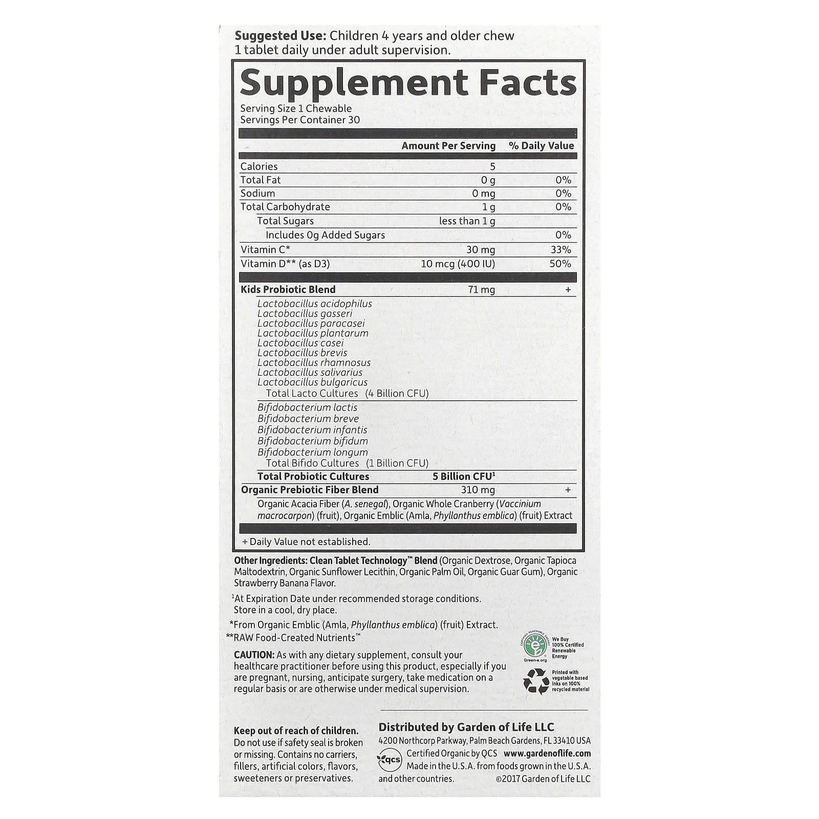 Probiotics + Vitamins C & DNo Refrigeration Required14 Probiotic StrainsPromotes Immune System and Digestive HealthUSDA OrganicNon-GMO Project VerifiedGluten Free – NSFDairy FreeSoy FreeNo Sugar AddedProbiotic SupplementVegetarianShelf Stable¹ – New Desiccant-Lined Bottle Technology for Shelf Stable ProbioticsCertified Organic by QCSDavid Perlmutter, M.D.Formulated by America’s Brain-Health Expert, a Board-Certified Neurologist, #1 New York Times best-selling author, Fellow of the American College of Nutrition, and expert in the human MICROBIOME.Dr. Perlmutter created this unique Immune System and Digestive Support formula especially for kids. Each chewable is Certified USDA Organic, tastes great and has no added sugar. Immune System & Digestive Support5 Billion CFU, 14 Probiotics. Vitamins C & DVitamin C from Organic Amla (30mg), Vitamin D (400 IU) and prebiotic fiber all help maintain a healthy immune system.+ Organic Matters Grown without toxic pesticides, antibiotics, hormones and no genetic engineering.1At Expiration Date under recommended storage conditions.