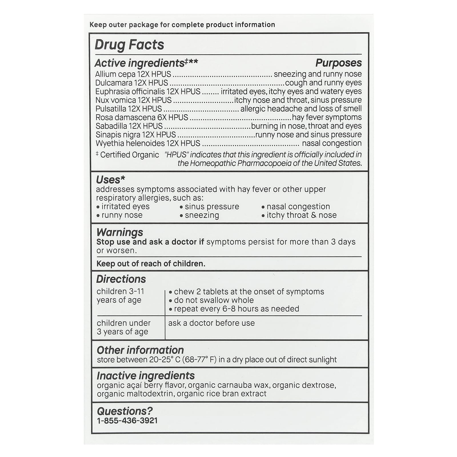 Drug FactsActive ingredients‡**PurposeAllium cepa 12X HPUSsneezing and runny noseDulcamara 12X HPUScough and runny eyesEuphrasia officinalis 12X HPUSirritated eyes, itchy eyes and watery eyesNux vomica 12X HPUSitchy nose and throat, sinus pressurePulsatilla 12X HPUSallergic headache and loss of smellRosa damascena 6X HPUShay fever symptomsSabadilla 12X HPUSburning in nose, throat and eyesSinapis nigra 12X HPUSrunny nose and sinus pressureWyethia helenoides 12X HPUSnasal congestionInactive Ingredients: Organic acai berry flavor, organic carnauba wax, organic dextrose, organic maltodextrin, organic rice bran extract.”HPUS” indicates that this ingredient is officially included in the Homeopathic Pharmacopoeia of the United States.‡ Certified Organic**X is a homeopathic dilution