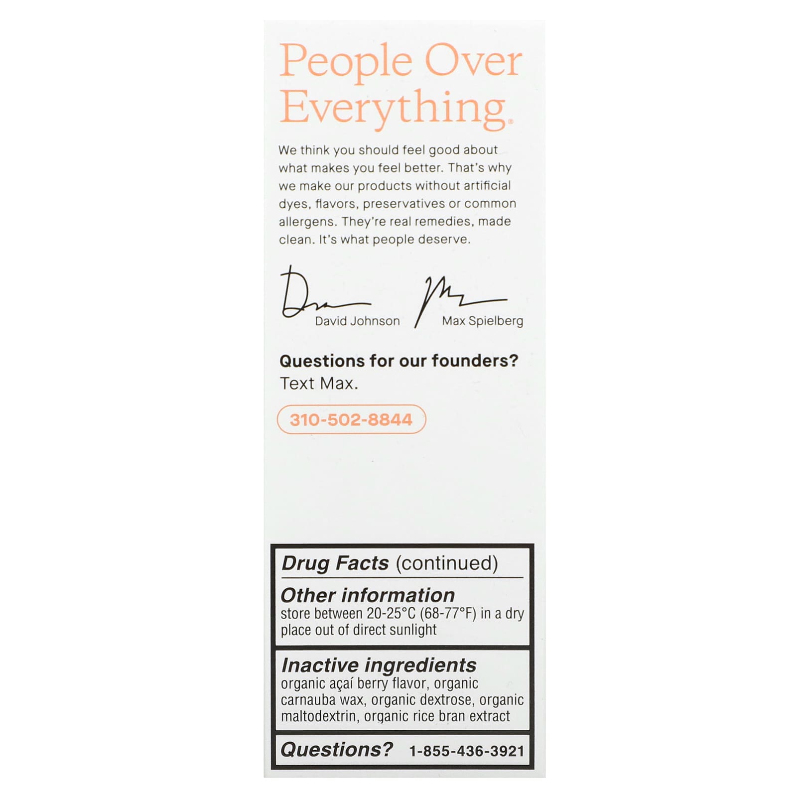 Non-Drowsy Organic Cold & CoughCongestion & MucusRunny Nose & SneezingCough & Sore ThroatUSDA OrganicNon GMO Project VerifiedHomeopathicKnow Your Ingredients Made Without: Common Allergens, Artificial Sweeteners or ParabensCertified B CorporationCertified Gluten-FreeCertified VeganCertified Organic by SCS Global ServicesPeople Over Everything. We think you should feel good about what makes you feel better. That´s why we make our products without artificial dyes, flavors, preservatives or common allergens. They´re real remedies, made clean. It´s what people deserve. Uses*Addresses symptoms associated with the common cold, such as:Chest congestionCoughNasal congestionSore throatRunny noseSneezingOnly Ingredients People DeserveOrganic homeopathic blendOrganic acai berry flavorOrganic carnauba waxOrganic dextroseOrganic maltodextrinOrganic rice bran extractAnd that´s all.