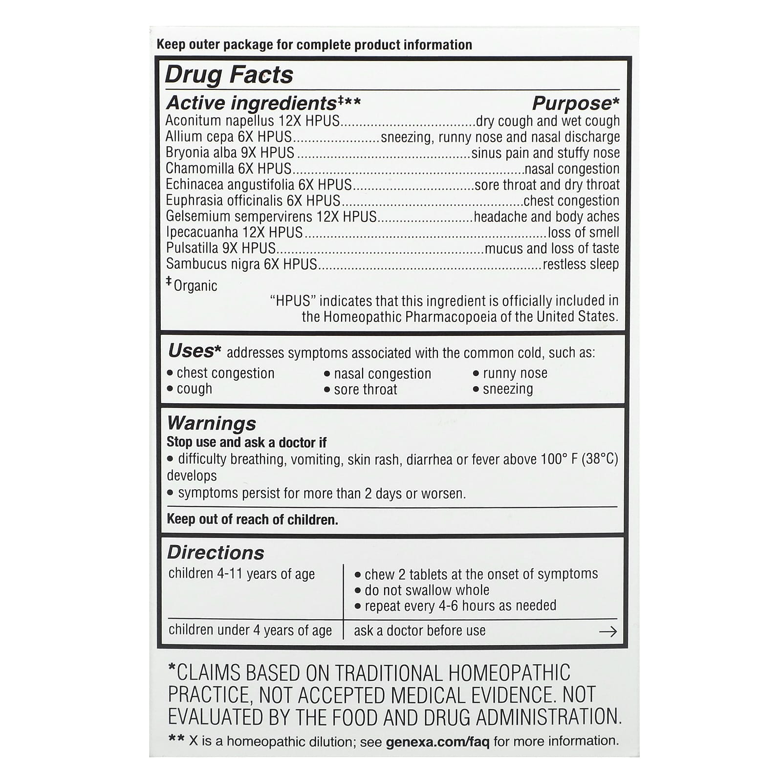 Drug FactsActive Ingredients‡** PurposesAconitum napellus 12X HPUSdry cough and wet coughAllium cepa 6X HPUSsneezing, runny nose and nasal dischargeBryonia alba 9X HPUSsinus pain and stuffy noseChamomilla 6X HPUSnasal congestionEchinacea angustifolia 6X HPUSsore throat and dry throatEuphrasia officinalis 6X HPUSchest congestionGelsemium sempervirens 12X HPUSheadache and body achesIpecacuanha 12X HPUSloss of smellPulsatilla 9X HPUSmucus and loss of tasteSambucus nigra 6X HPUSrestless sleep”HPUS” indicates that this ingredient is officially included in the Homeopathic Pharmacopoeia of the United States.‡Certified Organic**X is a homeopathic dilutionInactive IngredientsOrganic acai berry flavor, organic carnauba wax, organic dextrose, organic maltodextrin, organic rice bran extract