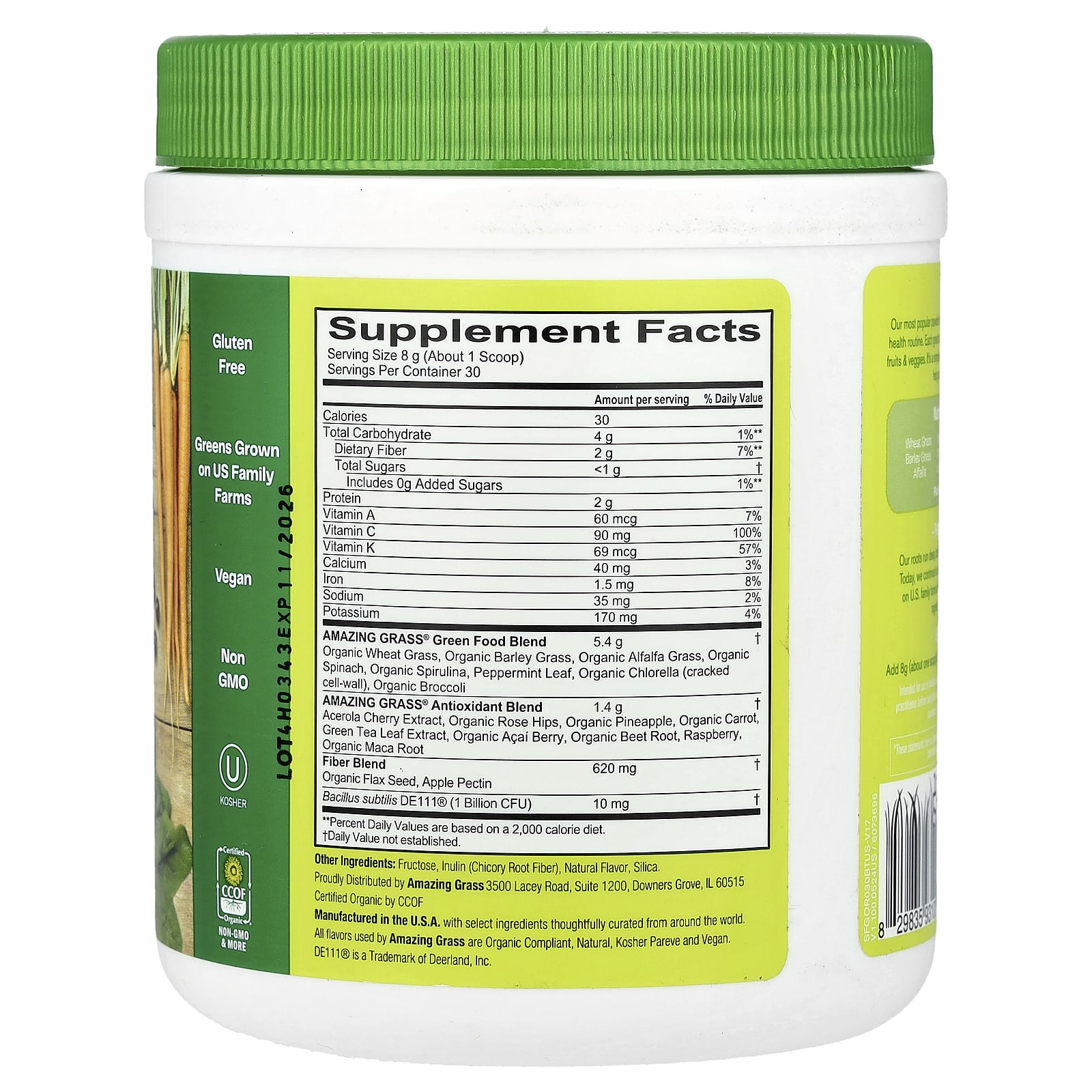 The OriginalSupports VitalitySupports ImmunitySupports Gut HealthDietary SupplementGluten FreeGreens Grown on US Family FarmsVeganNon GMOKosherCertified Organic by CCOF1 Billion CFU ProbioticsA Blend of 14 Greens, Fruits & Veggies100% DV of Vitamin CConvenient PowderThe Original Our most popular powder blend is an easy way to add more whole food nutrition to your health routine. Each great tasting scoop contains a blend of nutritious greens, fruits & veggies. It’s a simple way to support your overall health and wellness to help you feel amazing every day.Nutrition Made Easy.Wheat Grass Barley Grass AlfalfaSpirulina Chlorella Broccoli SpinachBeet Root Carrot PineappleAcai Berry Maca RootPlus: Acerola Cherry & More…Farm Family Roots Our roots run deep, back to a 3rd generation family farm in Kansas. Today, we continue to use organically grown, cereal grasses produced on U.S. family farms and craft them with high-quality plant-based ingredients from around the world.All flavors used by Amazing Grass are organic compliant, natural, kosher pareve and vegan.