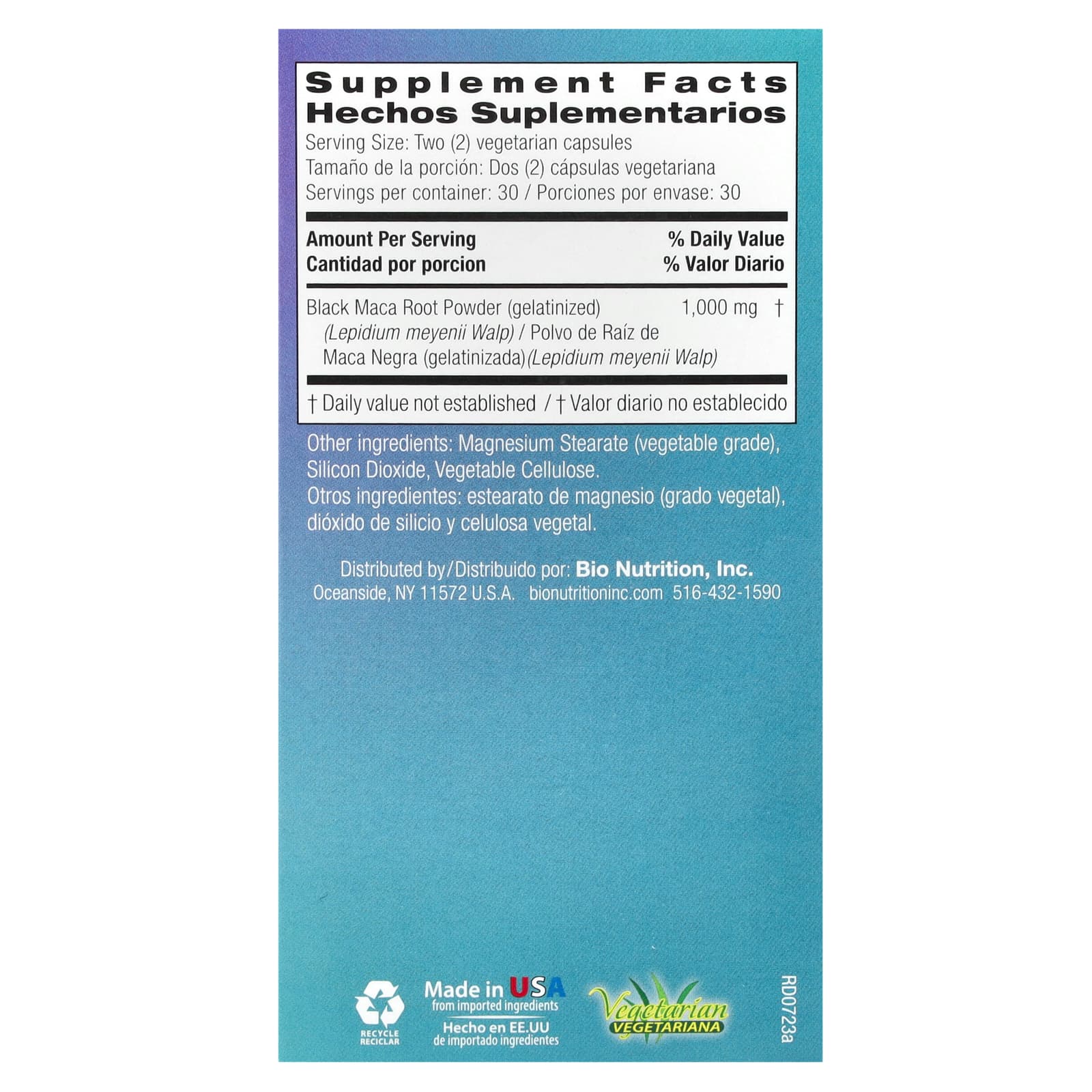 1,000 mg Per 2 Capsule ServingDietary SupplementVegetarianGelatinized Black Maca is considered an Adaptogen Bio Nutrition’s Black Maca from Peru is considered the rarest of the 3 Macas. May help support energy, stamina, and strength. Gelatinized Maca is up to 90% more absorbable than non gelatinized Maca Root.