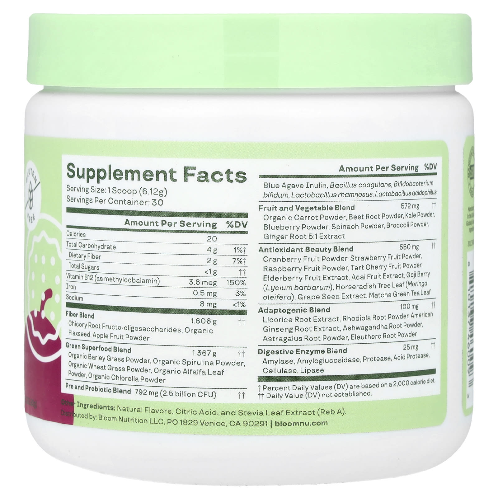 Gluten FreeDigestiveBloatingEnergy Dietary SupplementManufactured in a cGMP FacilityDairy FreeNon GMOFemale FoundedHere at Bloom, our goal is to help you bloom into the best version of you.