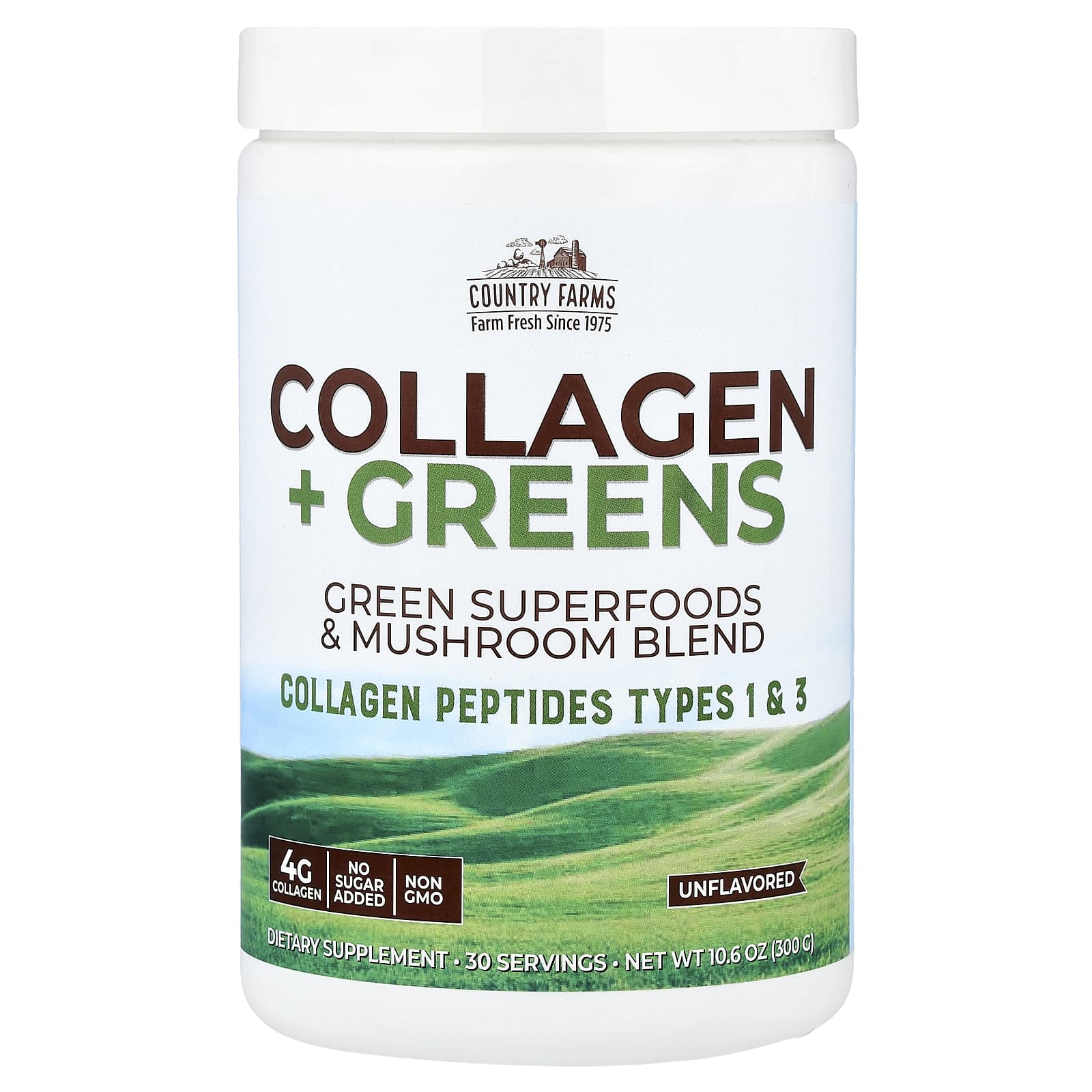 Farm Fresh Since 1975Green Superfoods & Mushroom BlendCollagen Peptides Types 1 & 34 g CollagenNo Sugar Added Non GMO Dietary SupplementAlkalize – Energize – RevitalizeCountry Farms® provides a convenient, energizing and nourishing drink that can be incorporated into your daily regimen. Collagen + Greens provides a great addition to your favorite shake or smoothie and an easy way to pack nutrition with a daily dose of greens, mushrooms and collagen types 1 & 3. Country Farms® Collagen + Greens nutritionally packed all-in-one supplement is NON-GMO and ready to use.