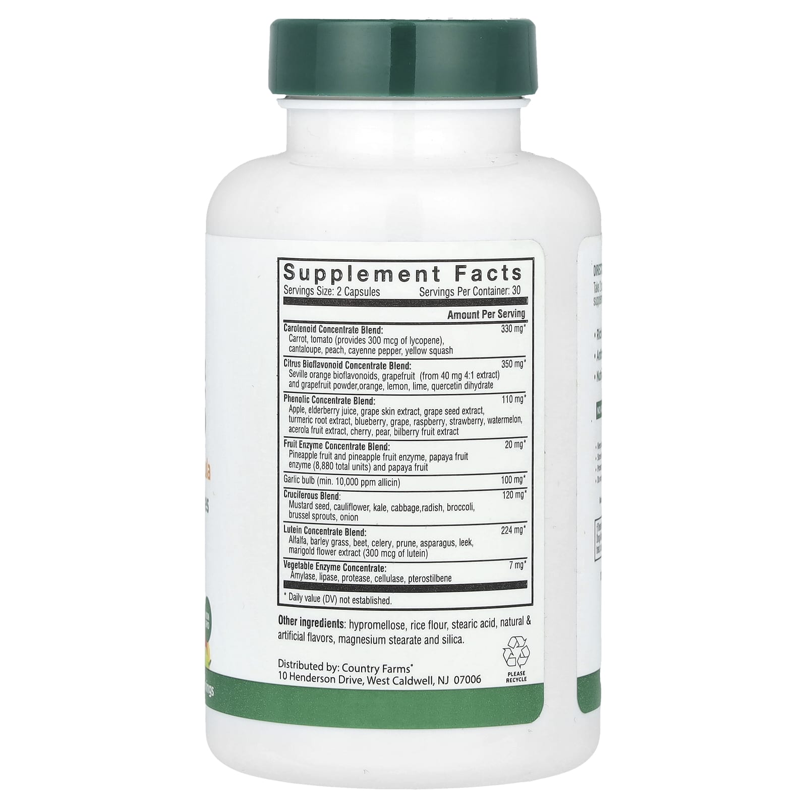 Farm Fresh Since 1975Daily Phytonutrients FormulaOver 50 Fruits & VegetablesVitamins, Antioxidants, Minerals, Enzymes & Green FoodsSugar FreeVeganNon GMODietary SupplementRich in FiberNutrient RichWhole FoodsEnergy BoostActive EnzymesNo Artificial ColorsNo SweetenersCountry Farms Fruits & Veggies Capsules combine equal parts convenience and nutrition, and with no juicing necessary! This formula was developed to help you meet your daily required intake of phytonutrients and antioxidants. Each serving contains numerous kinds of fruits, vegetables and botanicals, all natural and prepared to provide your body with what it craves.Country Farms strives to inspire quality, natural health choices. This easy-to-swallow supplement is a powerhouse of vitamins, minerals, antioxidants, enzymes and green foods. The formula offers a comprehensive blend of fruit and vegetable enzymes, citrus bioflavonoids, cruciferous blend, plus, phenolic, carotenoid, and lutein concentrates.All of these ingredients help promote energy levels, better digestion and boost the immune system which will help to keep you going to lead an active lifestyle. These are all essential to support overall wellbeing. Fruits & Veggies Capsules are convenient and helpful for busy schedule, especially when you can’t eat properly.