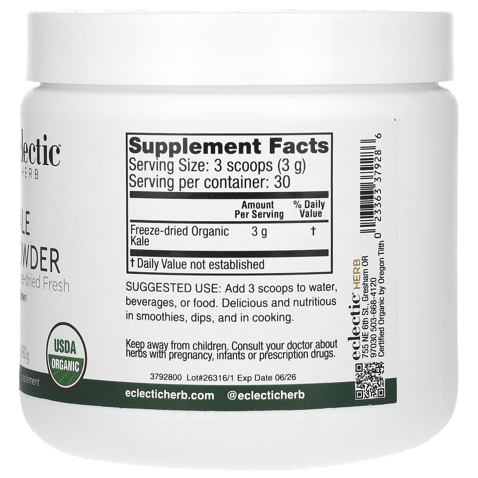Freeze-Dried FreshUSA GrownUSDA OrganicDietary SupplementConcentrated 8 1/1 X Through Freeze-DryingSoy FreeNon-GMOGluten FreeWhole HerbRaw FoodVeganCertified Organic by Orgeon TilthOur Kale is locally grown and fresh freeze-dried in-house in small batches. Freeze-drying is the best method of preservation as it naturally concentrates the nutrients in the plant by removing only the water.