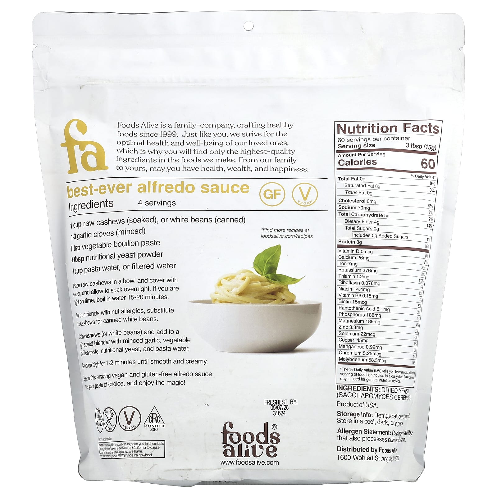 A Better Foods Company 100% Natural Unfortified Pure MadeNon GMOGluten FreeVegan Kosher Per 15 g Serving:60 Calories 8 g Protein 16% DV4 g Fiber 14% DV189 mg Magnes. 45% DVTo say the least, it’s cheesy yeast. Cultured on a sweet mixture of beet molasses and corn sugar, this deactivated powder provides a non-fortified source of dietary fiber, vitamins, minerals, and protein. Not to be cheesy, but you hold pure vegan gold.Foods Alive is a family-company, crafting healthy foods since 1999. Just like you, we strive for the optimal health and well-being of our loved ones, which is why you will find only the highest-quality ingredients in the foods we make. From our family to yours, may you have health, wealth, and happiness.