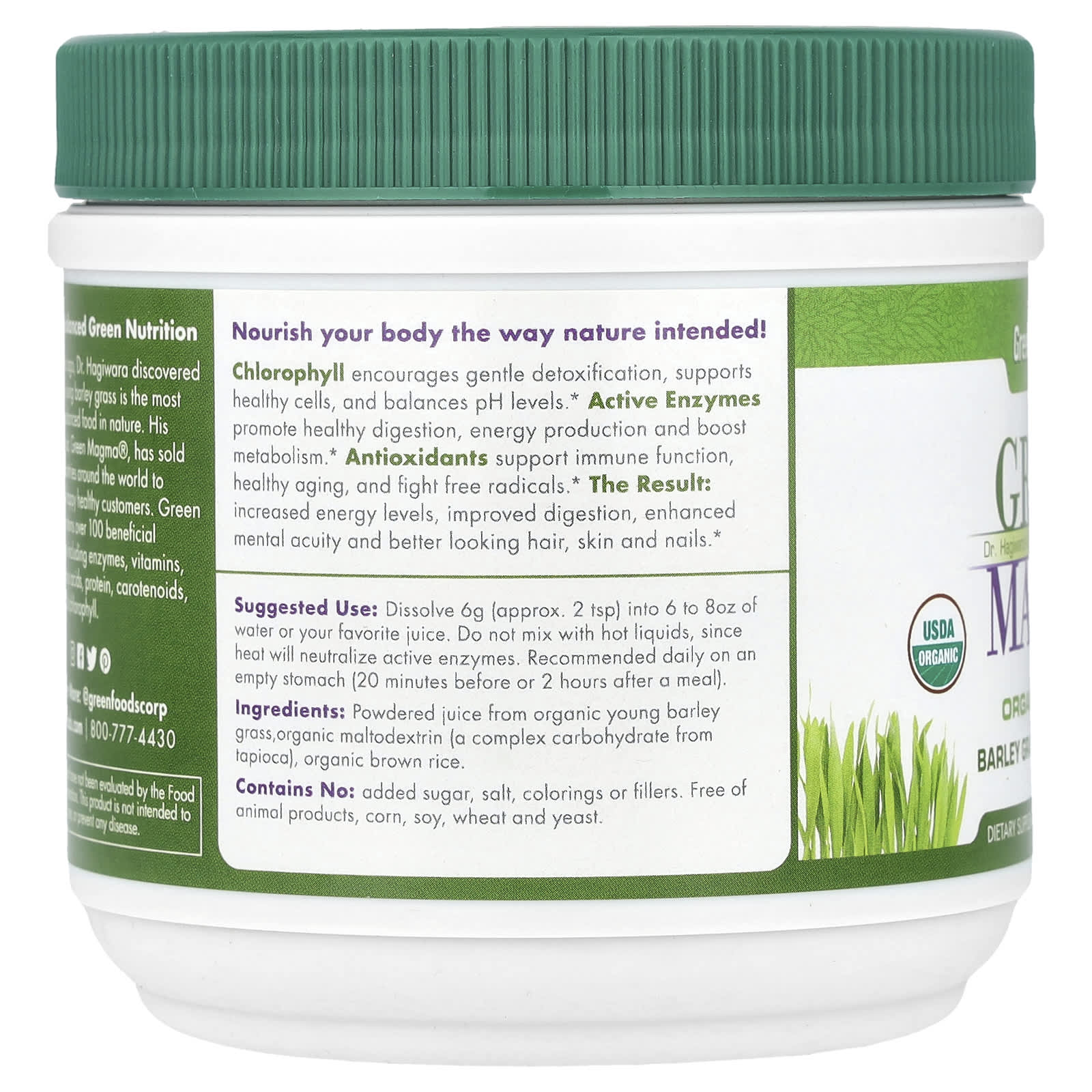 Dr. Hagiwara’s Original Formula Since 1969Organic & RawUSDA OrganicDietary SupplementNatural Vegan ProductNon-GMOKosherGluten FreeCertified Organic by QAIPerfectly Balanced Green NutritionOver 40 years ago, Dr. Hagiwara discovered that organic young barley grass is the most nutritionally balanced food in nature. His original formula, Green Magma®, has sold in over 50 countries around the world to thousands of happy healthy customers. Green Magma® contains over 100 beneficial phytonutrients including enzymes, vitamins, minerals, amino acids, protein, carotenoids, flavonoids and chlorophyll.Nourish your body the way nature intended! Chlorophyll encourages gentle detoxification, supports healthy cells, and balances pH levels. Active Enzymes promote healthy digestion, energy production and boost metabolism. Antioxidants support immune function, healthy aging, and fight free radicals. The Result: increased energy levels, improved digestion, enhanced mental acuity and better looking hair, skin and nails.Every batch is third party lab tested for purity, safety and more.