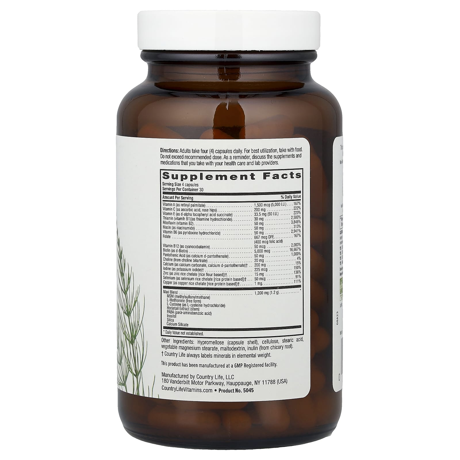 5,000 mcg Biotin Per ServingCertified Gluten-Free™Dietary SupplementMaxi Blend of Botanicals & Amino AcidsPowered by B VitaminsVegetarian CapsuleIgen™ Non-GMO VerifiedCertified B Corporation— Our Pledge of Integrity —AuthenticityCleanlinessFreshnessConsistencyAccuracyThis product, which is formulated with B vitamins, biotin and MSM, brings life back to your hair, skin and nails.Maxi-Hair® Plus (in vegetarian capsules) contains 5 mg (5,000 mcg) of biotin. (per serving)YESCertified Gluten-Free by GFCO.orgNOWheat or MilkYESCertified Vegetarian by the AVANOPreservativesYESRecyclable PackagingNOArtificial Colors, Flavors or SweetenersYESManufacturing Supports Wind Power