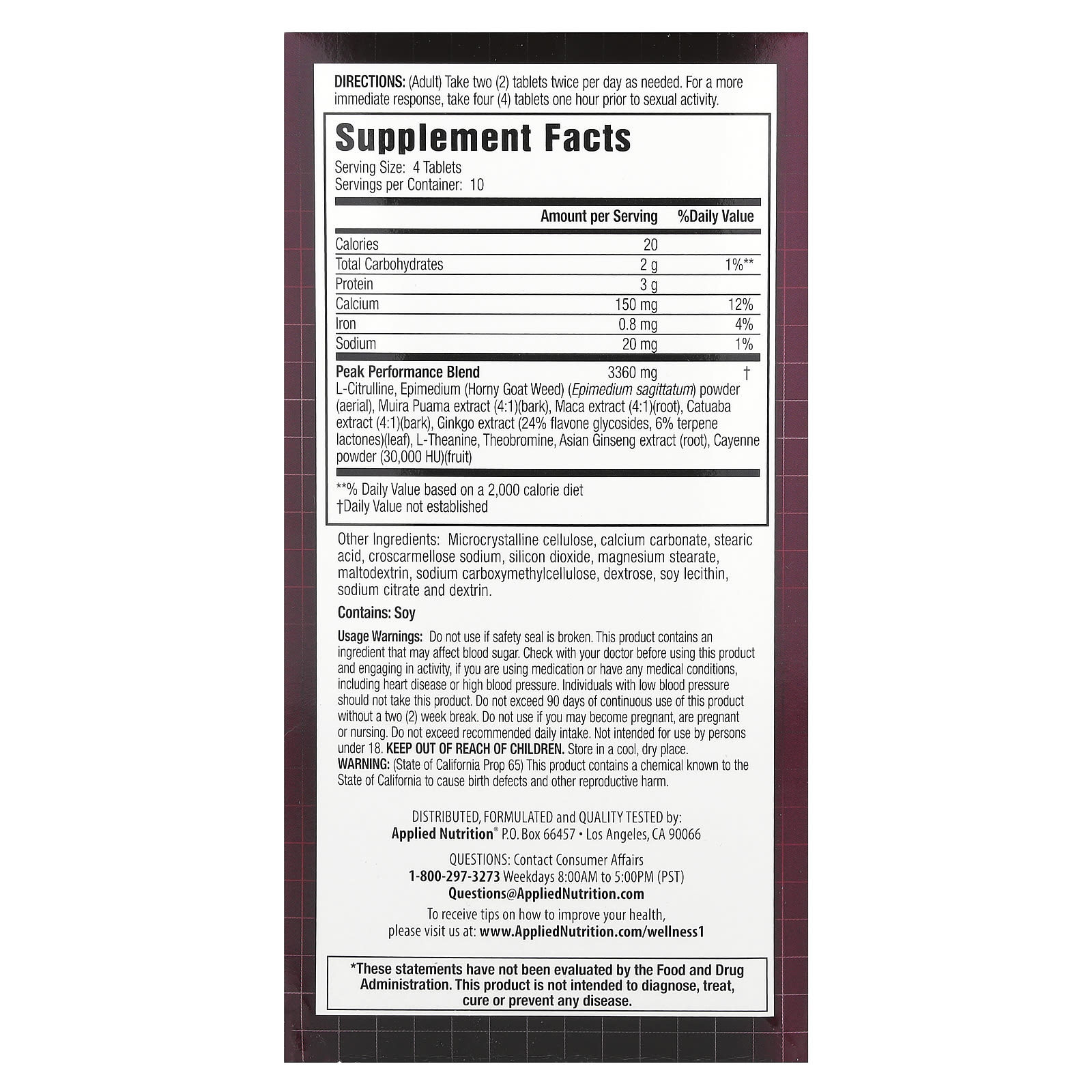 Do not use if safety seal is broken. This product contains an ingredient that may affect blood sugar. Check with your doctor before using this product and engaging in activity, if you are using medication or have any medical conditions, including heart disease or high blood pressure. Individuals with low blood pressure should not take this product. Do not exceed 90 days of continuous use of this product without a two (2) week break. Do not use if you may become pregnant, are pregnant or nursing. Do not exceed recommended daily intake. Not intended for use by persons under 18. Keep out of reach of children. Store in a cool, dry place. (State of California Prop 65) This product contains a chemical known to the State of California to cause birth defects and other reproductive harm.