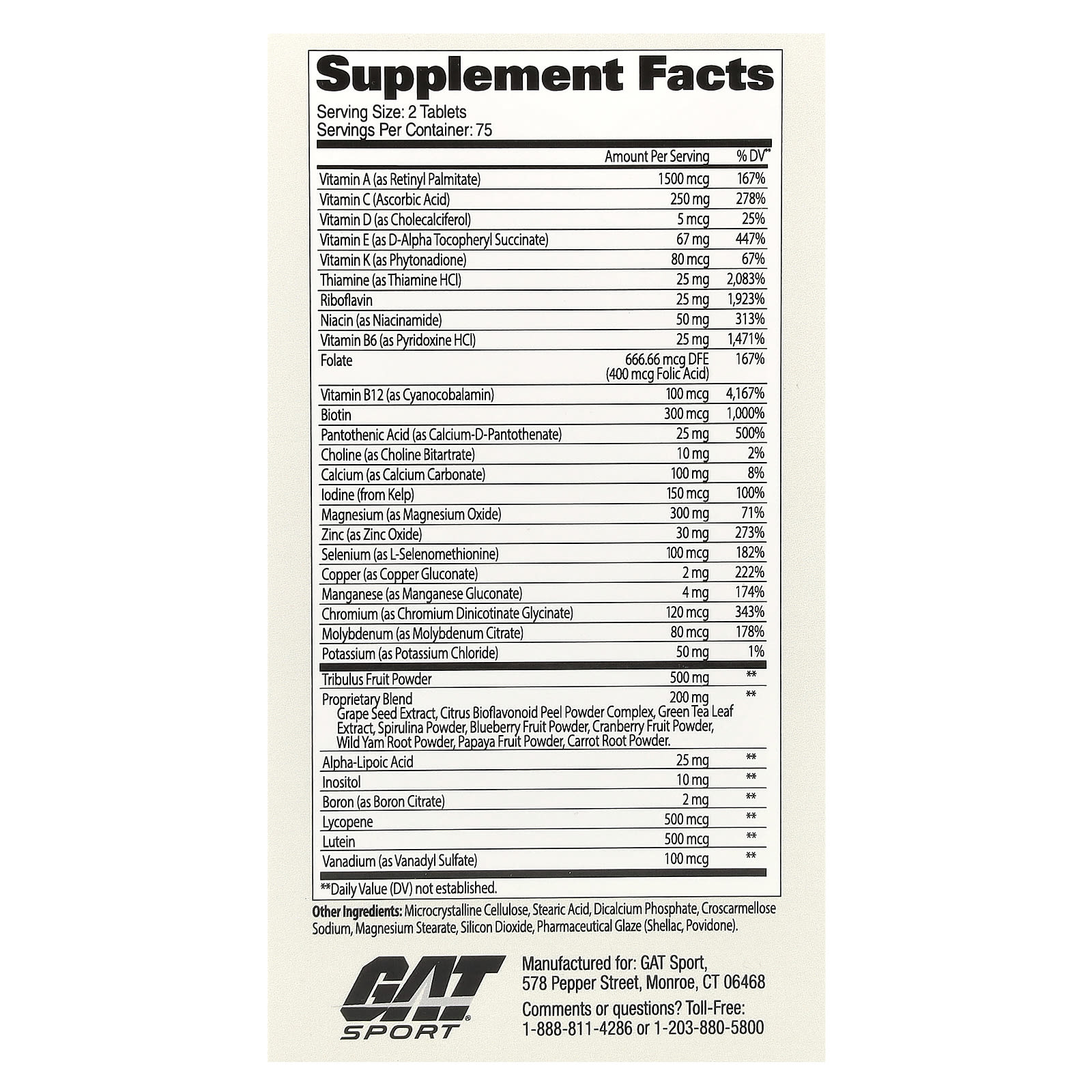 Value SizeMultivitamin with Testosterone SupportEssentialsSupports Healthy Immune FunctionComplete Nutrient Support for AthletesGAT Authentic – Satisfaction GuaranteedFormulated For Active MenDietary SupplementUltimate Performance VitaminBoost TestImmunityEnergy#CompeteHarderMens Multi+Test is a complete vitamin, mineral and energy multivitamin with added men’s virility ingredient Tribulus Terristis. GAT Mens Multi offers athletes complete support for nutrient deficiencies they may need with an added virility and testosterone boost.