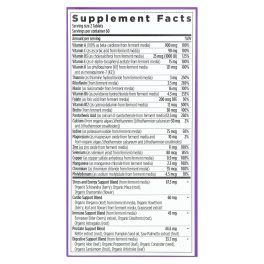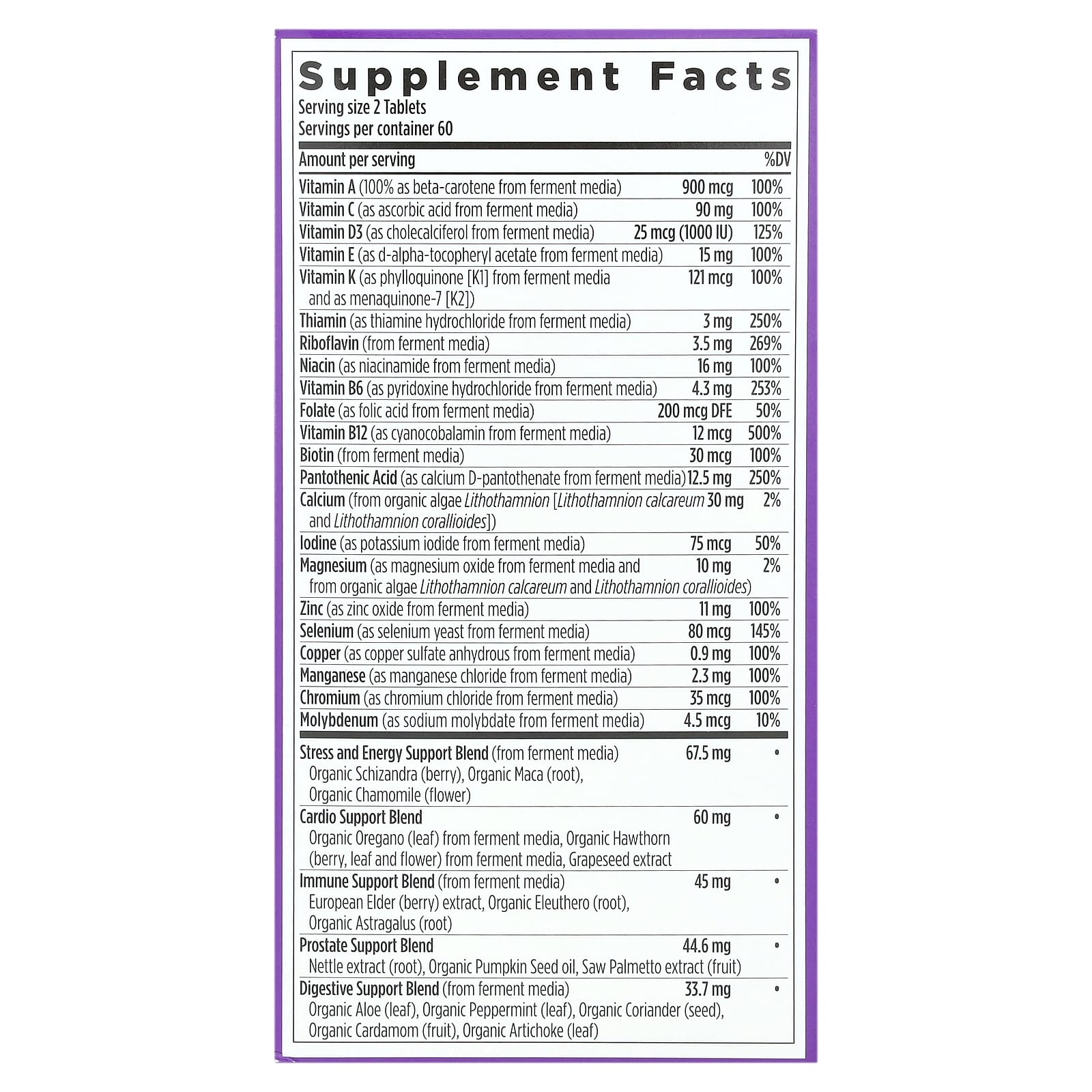 Est. 1982Formulated for AbsorptionMade with Organic Vegetables and HerbsCertified Organic by Where Food Comes From OrganicNon GMO Project VerifiedCertified Gluten-Free by NSFKosherDietary SupplementWith Gratitude from Vermont100% VegetarianNo Artificial Flavors or ColorsNutrition Crafted for: Immune, Heart, Energy, Stress & Brain SupportThe Magic Inside: Higher levels of essential nutrients† your body can recognize, blended with superfood herbs including Elderberry, Turmeric & Saw PalmettoComplete MultivitaminNutrition-Packed For MenComplete support for men’s overall health and system-specific benefits, with nutrients for brain, bone & prostate support, stress, vision & digestive support, and healthy hair, skin & nails, packed into just 2 tablets a day.Immune & Energy BoostingFermented Zinc and Vitamins C & A support immune system function, while 8 B Vitamins promote energy metabolism.Heart HealthyEmerging studies suggest fermented Vitamin D3 supports cardiovascular health.Whole-Food HerbsInspired by tradition and grounded in science, advanced botanicals include Saw Palmetto, organic Turmeric and Maca.Absorb the Good StuffWe fine-tune the levels of each high-quality vitamin & mineral, choose types that work best with the body, and ferment key nutrients with probiotics and whole foods.Certified B Corporation® This company meets the highest standards of social and environmental impact† Compared to Every Man™’s One Daily multivitamin, this blend has higher levels of Thiamin, Riboflavin, Vitamins B6 & B12, Selenium, Manganese & Chromium