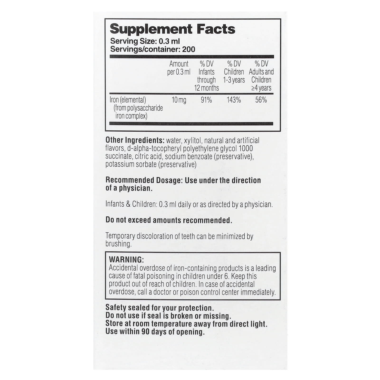 Temporary discoloration of teeth can be minimized by brushing.Accidental overdose of iron-containing products is a leading cause of fatal poisoning in children under 6. Keep this product out of reach of children. In case of accidental overdose, call a doctor or poison control center immediately.Safety sealed for your protection.Do not use if seal is broken or missing.Store at room temperature away from direct light.Use within 90 days of opening.