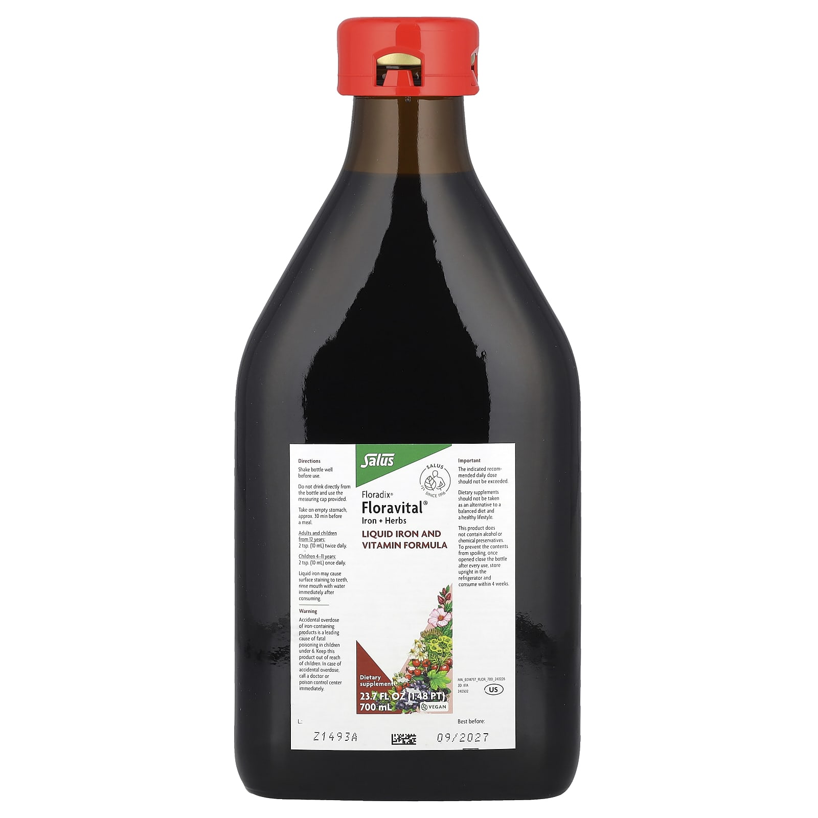 Salus Since 1916Liquid Iron and Vitamin FormulaSupports the Body’s Formation of Red Blood CellsEasy to Digest and AbsorbNon-Constipating FormulaGluten Free and Yeast-FreeDietary SupplementVeganNo AlcoholNo PreservativesNo ColoringsSuitable for VegansWith iron and b vitamins to support healthy iron levels to maintain energy.Floradix Floravital contains iron from ferrous gluconate, vitamin B1 (from thiamin hydrochloride), vitamin B2 (from riboflavin 5′-phosphate, sodium), vitamin B6 (from pyridoxine hydrochloride) and vitamin B12 (from cyanocobalamin) to support energy. Iron supports the body’s formation of red blood cells and hemoglobin.Healthy iron levels are essential to maintain energy for a healthy, active life.Containing nutritional iron in a gentle-to-digest and easily absorbed, non-constipating formula with essential B-complex vitamins, and herbal extracts. Floradix Floravital contains selected herbs and several fruit juice concentrates for a pleasant taste. About Salus Since the foundation of Salus Haus in 1916, the utmost importance has been placed on the careful selection of ingredients for our products. At Salus we do not use genetically modified raw materials. We combine nature with innovation and quality, developing new products with the use of state-of-the-art analytical methods in our laboratories. Salus applies the highest quality standards in Europe by carefully controlling the production of raw materials and finished products.