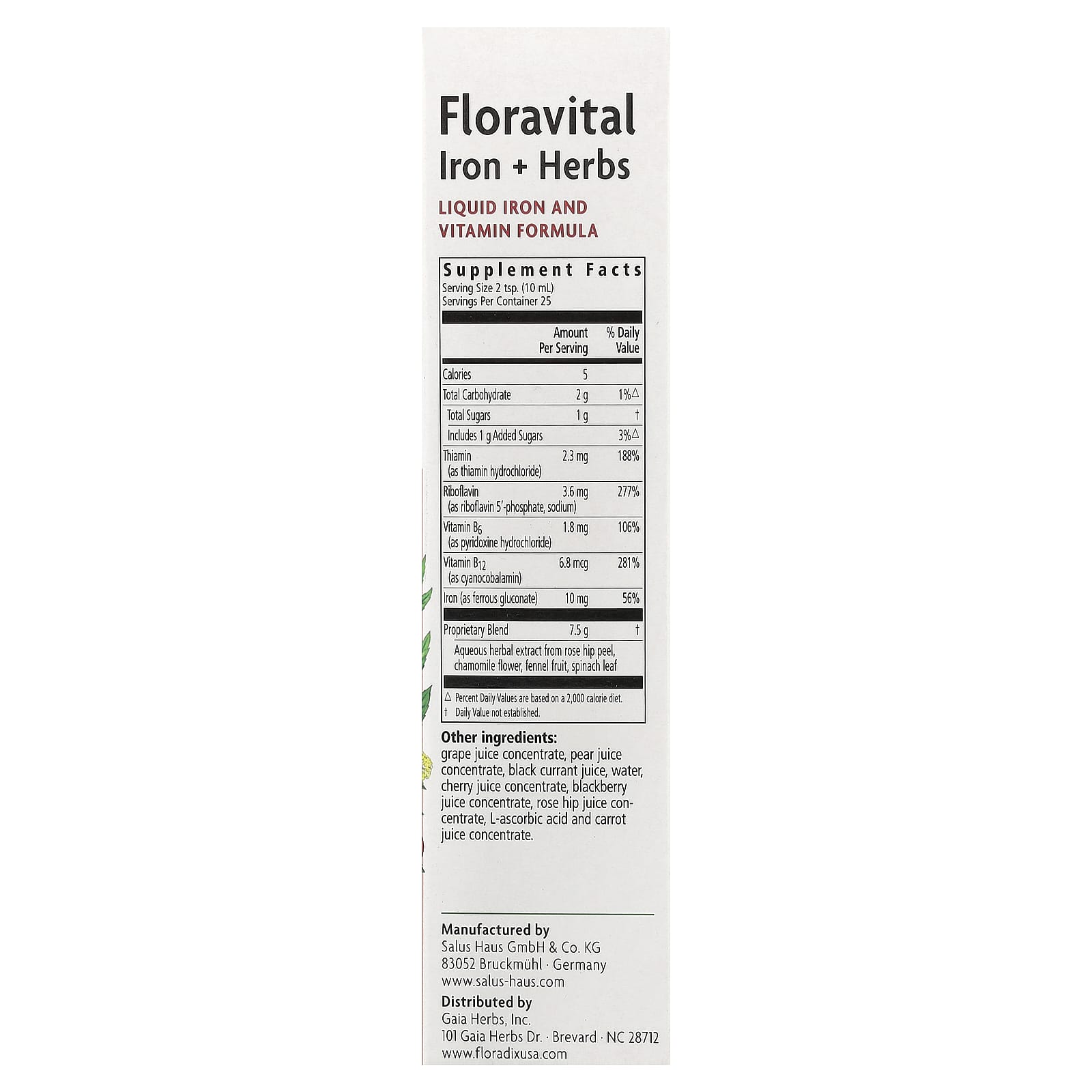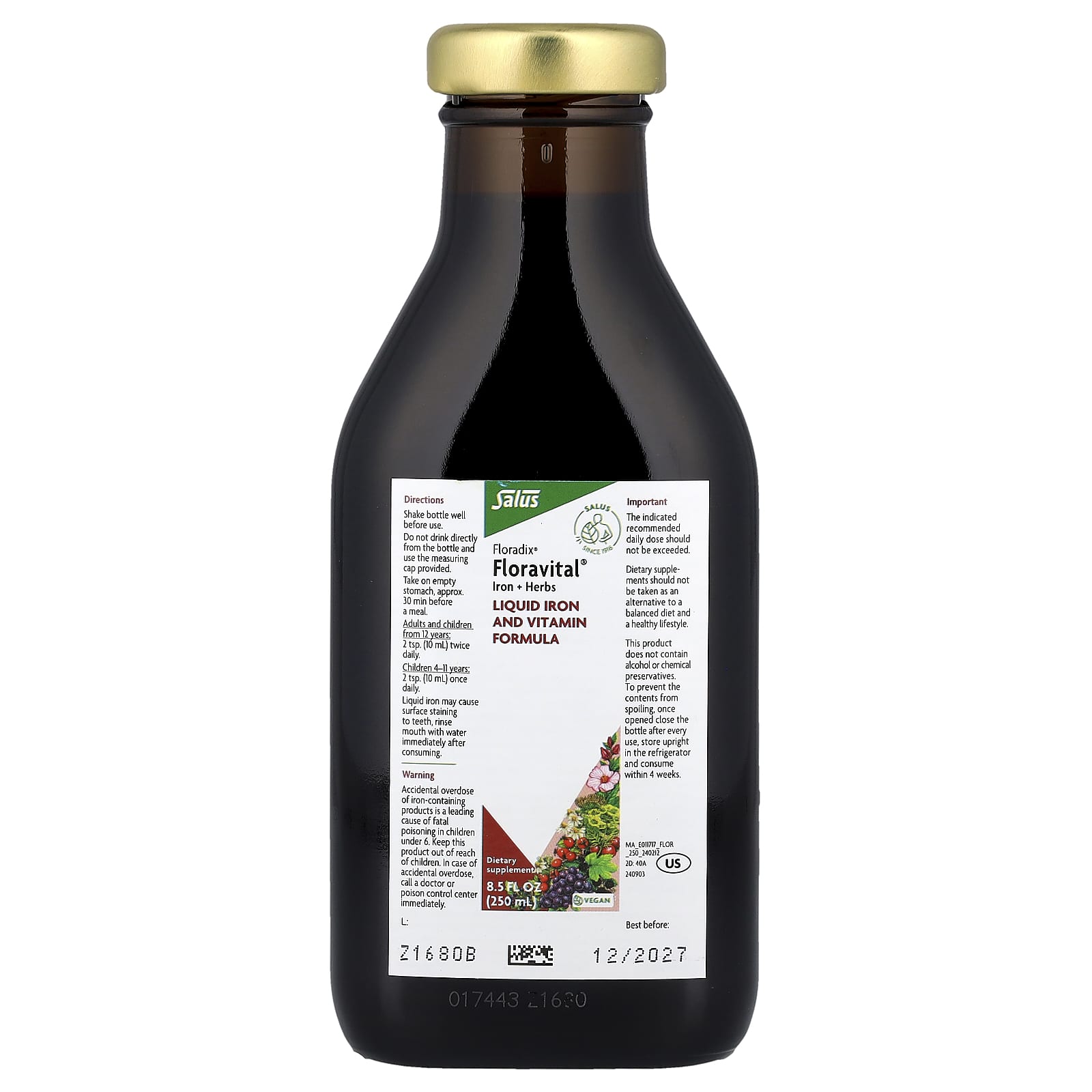 Since 1916Liquid Iron and Vitamin FormulaSupports The Body’s Formation of Red Blood CellsEasy to Digest and AbsorbNon-Constipating FormulaGluten-Free and Yeast-FreeDietary SupplementVegan No AlcoholNo PreservativesNo ColoringaSuitable For VegansWith iron and B vitamins to support healthy iron levels to maintain energy.Floradix Floravital contains iron from ferrous gluconate, vitamin B1 (from thiamin hydrochloride), vitamin B2 (from riboflavin 5′-phosphate, sodium), vitamin B6 (from pyridoxine hydrochloride) and vitamin B12 (from cyanocobalamin) to support energy.Iron supports the body’s formation of red blood cells and hemoglobin.Healthy iron levels are essential to maintain energy for a healthy, active life.Containing nutritional iron in a gentle-to-digest and easily absorbed, non-constipating formula with essential B-complex vitamins, and herbal extracts.Floradix Floravital contains selected herbs and several fruit juice concentrates for a pleasant taste. About SalusSince the foundation of Salus Haus in 1916, the utmost importance has been placed on the careful selection of ingredients for our products. At Salus we do not use genetically modified raw materials. We combine nature with innovation and quality, developing new products with the use of state- of-the-art analytical methods in our laboratories. Salus applies the highest quality standards in Europe by carefully controlling the production of raw materials and finished products.