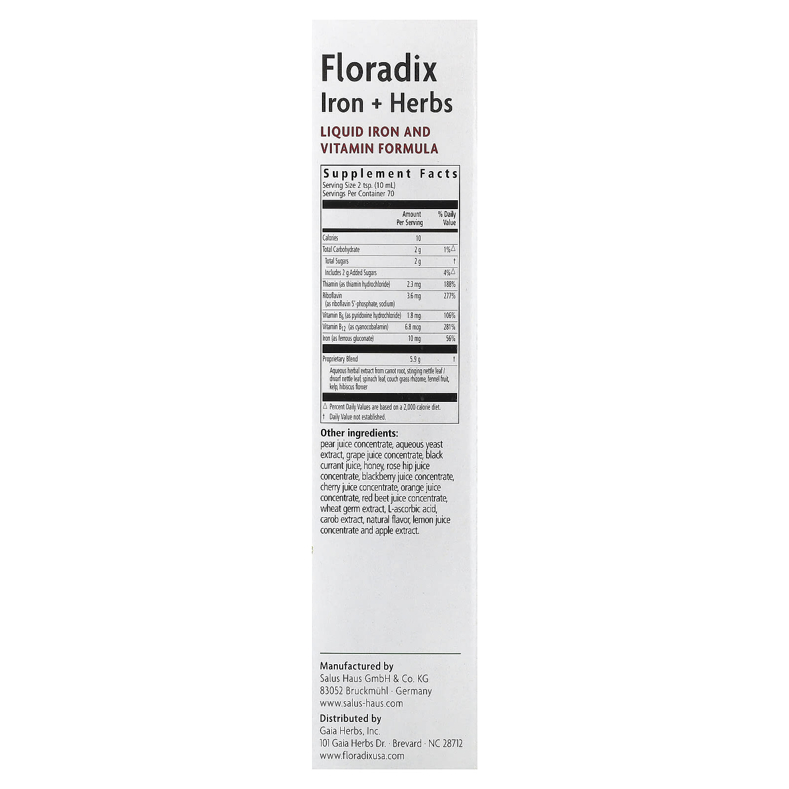 Salus Since 1916Liquid Iron and Vitamin FormulaSupports the Body’s Formation of Red Blood CellsEasy to Digest and AbsorbNon-Constipating FormulaDietary SupplementVegetarianNo AlcoholNo PreservativesNo ColoringsSuitable for VegetariansWith iron and B vitamins to support healthy iron levels to maintain energy.Floradix Iron + Herbs contains iron from ferrous gluconate, vitamin B1 (from thiamin hydrochloride), vitamin B2 (from riboflavin 5′-phosphate, sodium), vitamin B6 (from pyridoxine hydrochloride) and vitamin B12 (from cyanocobalamin) to support energy. Iron supports the body’s formation of red blood cells and hemoglobin.Healthy iron levels are essential to maintain energy for a healthy, active life.Containing nutritional iron in a gentle-to-digest and easily absorbed, non-constipating formula with essential B-complex vitamins, and herbal extracts.Floradix Iron + Herbs contains selected herbs and several fruit juice concentrates for a pleasant taste. About Salus Since the foundation of Salus Haus in 1916, the utmost importance has been placed on the careful selection of ingredients for our products. At Salus we do not use genetically modified raw materials. We combine nature with innovation and quality, developing new products with the use of state-of-the-art analytical methods in our laboratories. Salus applies the highest quality standards in Europe by carefully controlling the production of raw materials and finished products.