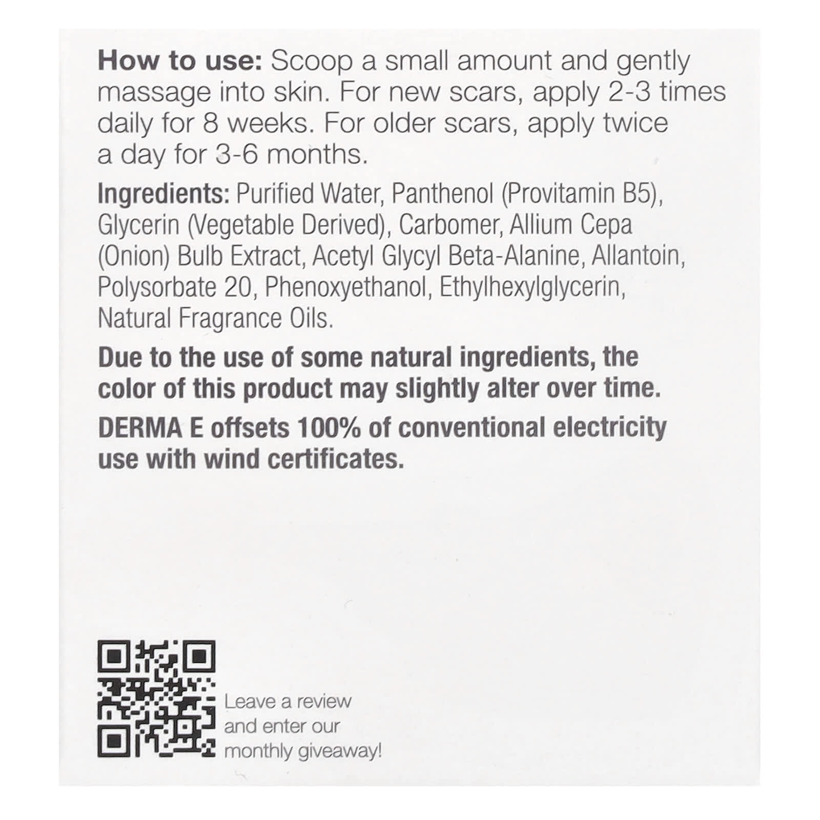 TherapeuticEco-Ethical100% VeganSoy-FreeDoctor DevelopedPanthenol & AllantoinDiminishes Visibility of ScarsDermatologist RecommendedLeaping Bunny®; Cruelty-FreeGluten FreeKiss scars goodbye.This non-oily gel is proven to significantly improve scar texture, color and overall appearance for softer, healthier-looking skin.Panthenol, Allantoin and Onion Bulb Extract help to hydrate, soothe and encourage self-healing. Scar Gel can also be used to soothe burns, sunburns, and tattoos as well as help to improve the appearance of stretch marks.Ethical BeautyClean, effective and dermatologist recommended, we are committed to your skin health, well-being and the natural environment. That’s the DERMA E difference.Since 1984, we are committed to skin health and safety:No Parabens No Phthalates No Formaldehyde No PetrolatumNo Sulfates No Mineral Oils No Artificial Colors No Artificial Fragrances