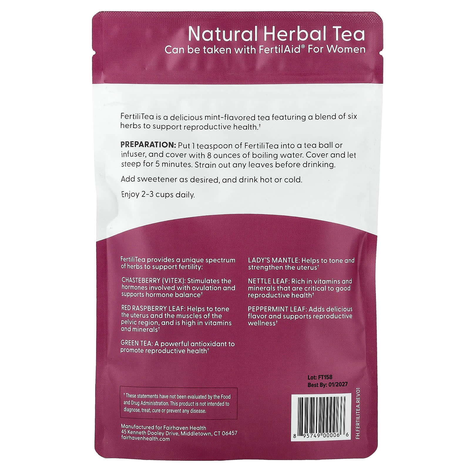 Can be Taken With FertilAid® for WomenNatural Herbal Tea to Support Female Reproductive HealthSpecial Fertility Blend of Organic and Wildcrafted Herbs, Including Chaste Tree Berry, Red Raspberry Leaf and Green TeaFertiliTea is a delicious mint-flavored tea featuring a blend of six herbs to support reproductive health.FertiliTea provides a unique spectrum of herbs to support fertility: Chasteberry (Vitex): Stimulates the hormones involved with ovulation and supports hormone balanceRed Raspberry Leaf: Helps to tone the uterus and the muscles of the pelvic region, and is high in vitamins and mineralsGreen Tea: A powerful antioxidant to promote reproductive healthLady’s Mantle: Helps to tone and strengthen the uterusNettle Leaf: Rich in vitamins and minerals that are critical to good reproductive healthPeppermint Leaf: Adds delicious flavor and supports reproductive wellness