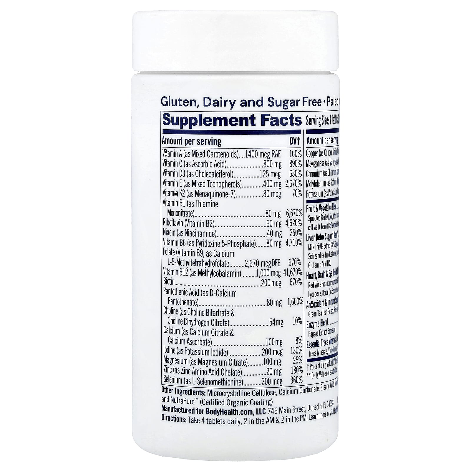 Dietary SupplementGluten, Dairy and Sugar FreePaleo and Keto-FriendlyComplete multivitamin, mineral & micronutrient blend with full spectrum antioxidant support.Includes liver support, methylfolate, chelated minerals, co q10, vitamin k2/d3, amino acids & whole food nutrition in bioavailable forms.
